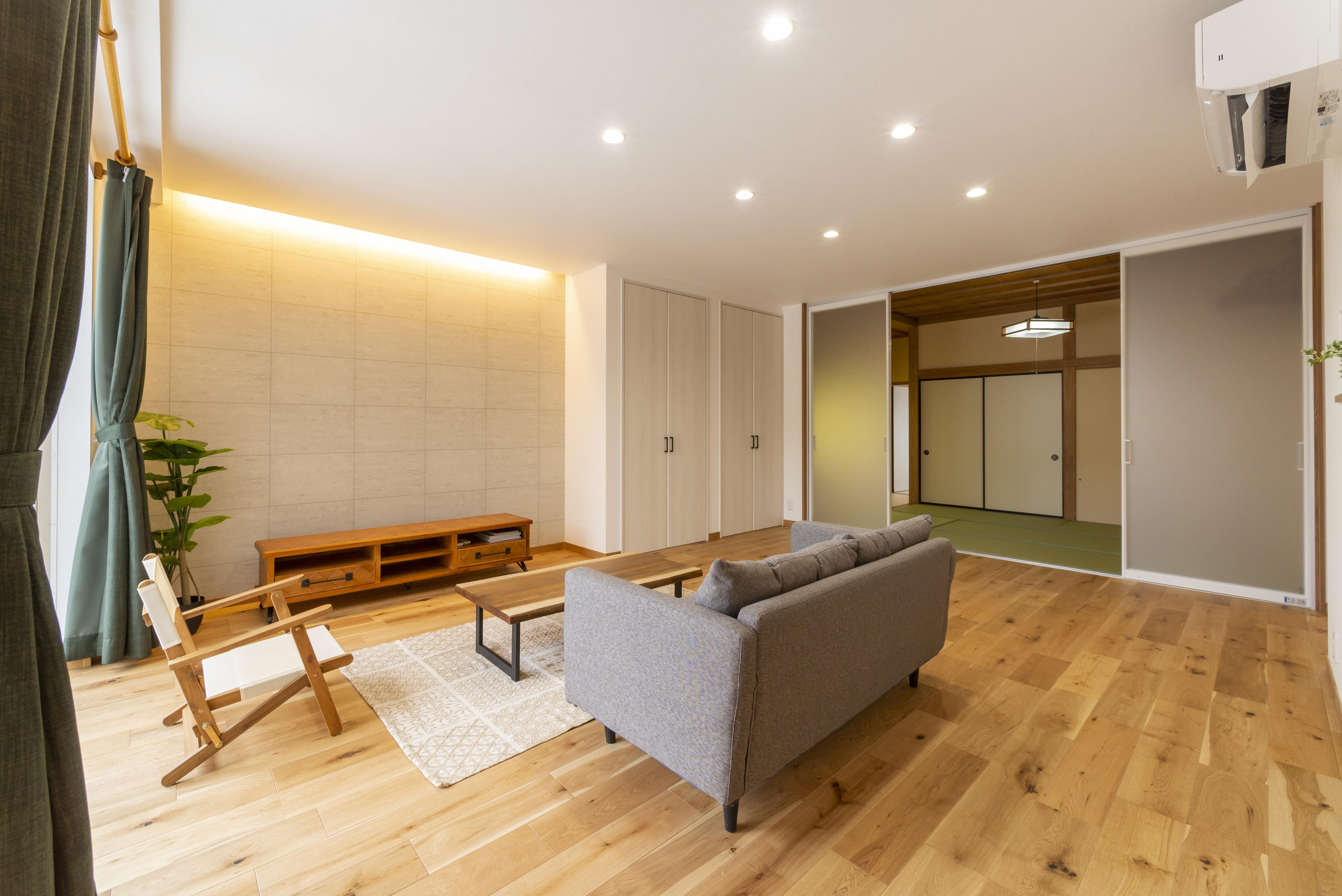 リビングと和室を区切るパーティション。和室とリビングを別空間にできるように、スクリーンパーティションを採用しております。