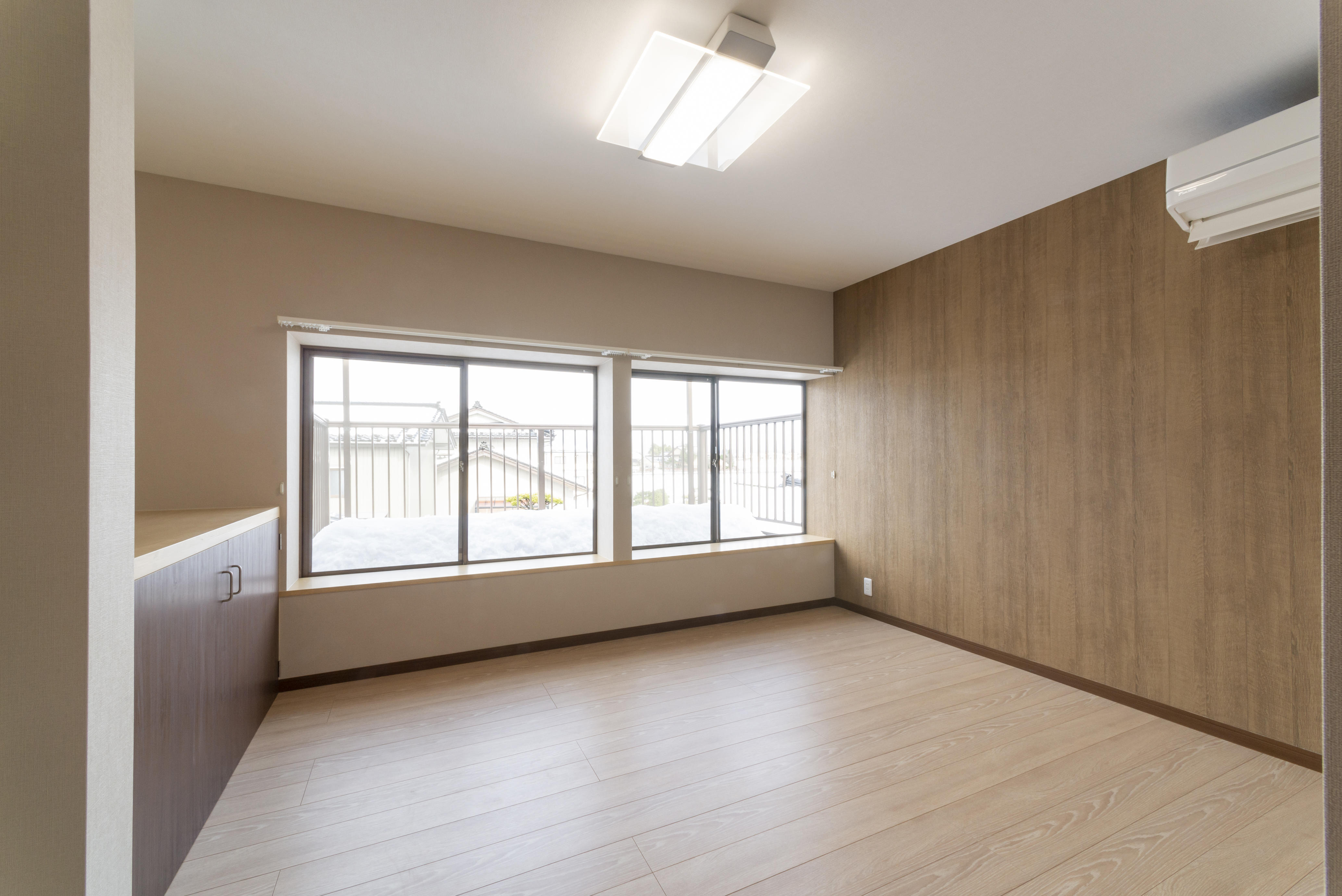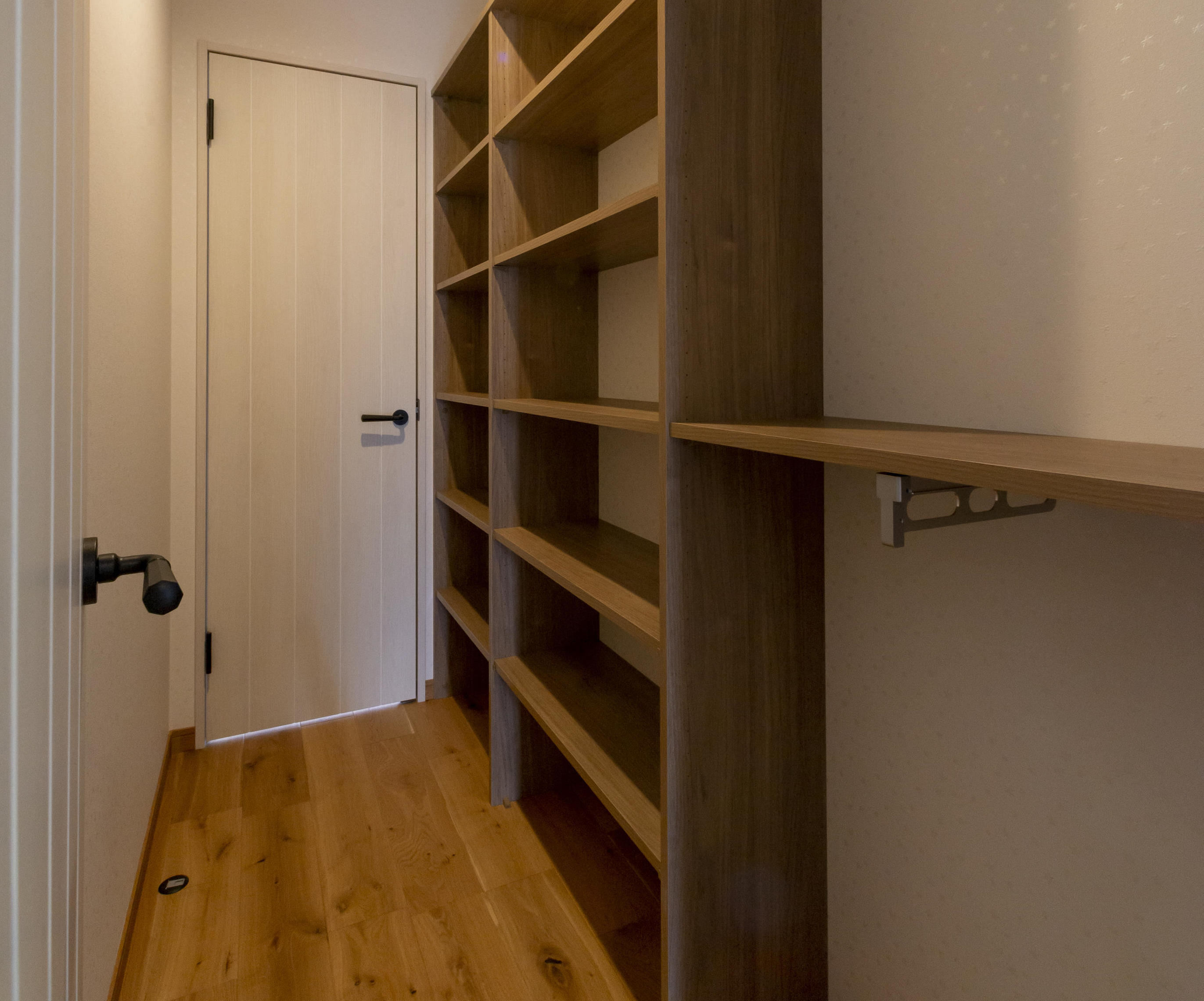 寝室は奥様こだわりの音楽のなる照明に。リラックスできるような空間にしました。収納棚やウォークインクローゼットのご要望を叶えるため、廊下を狭めて広々とした寝室に仕上げました。