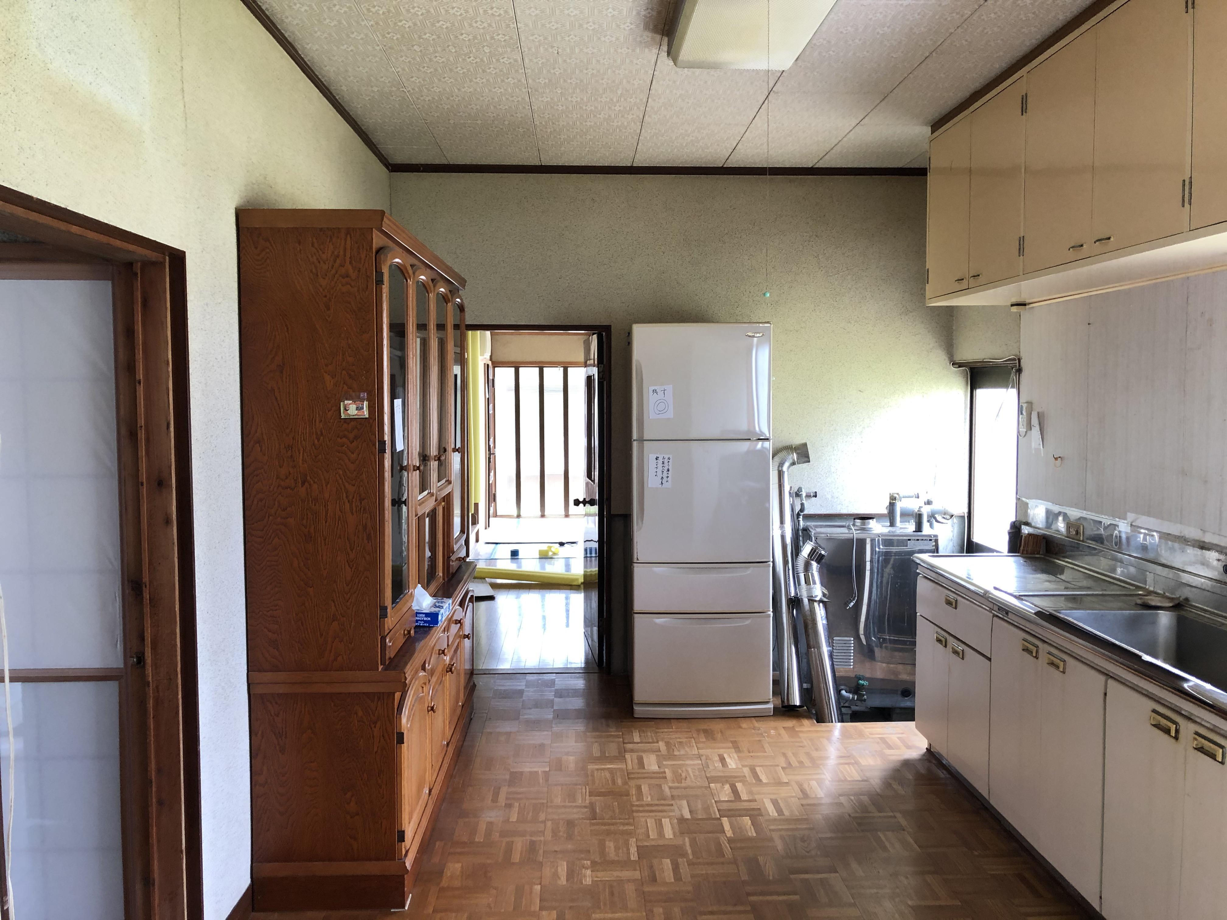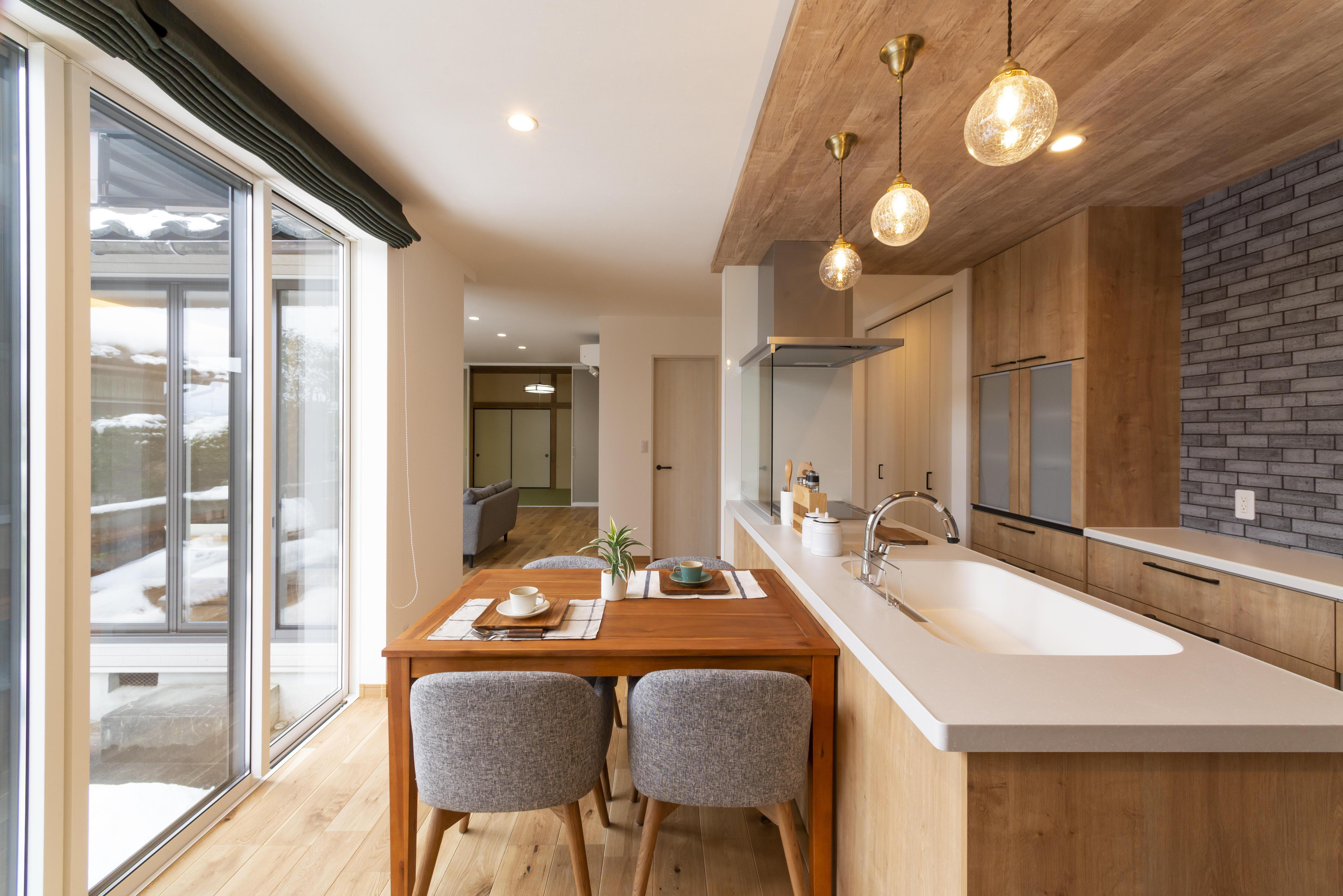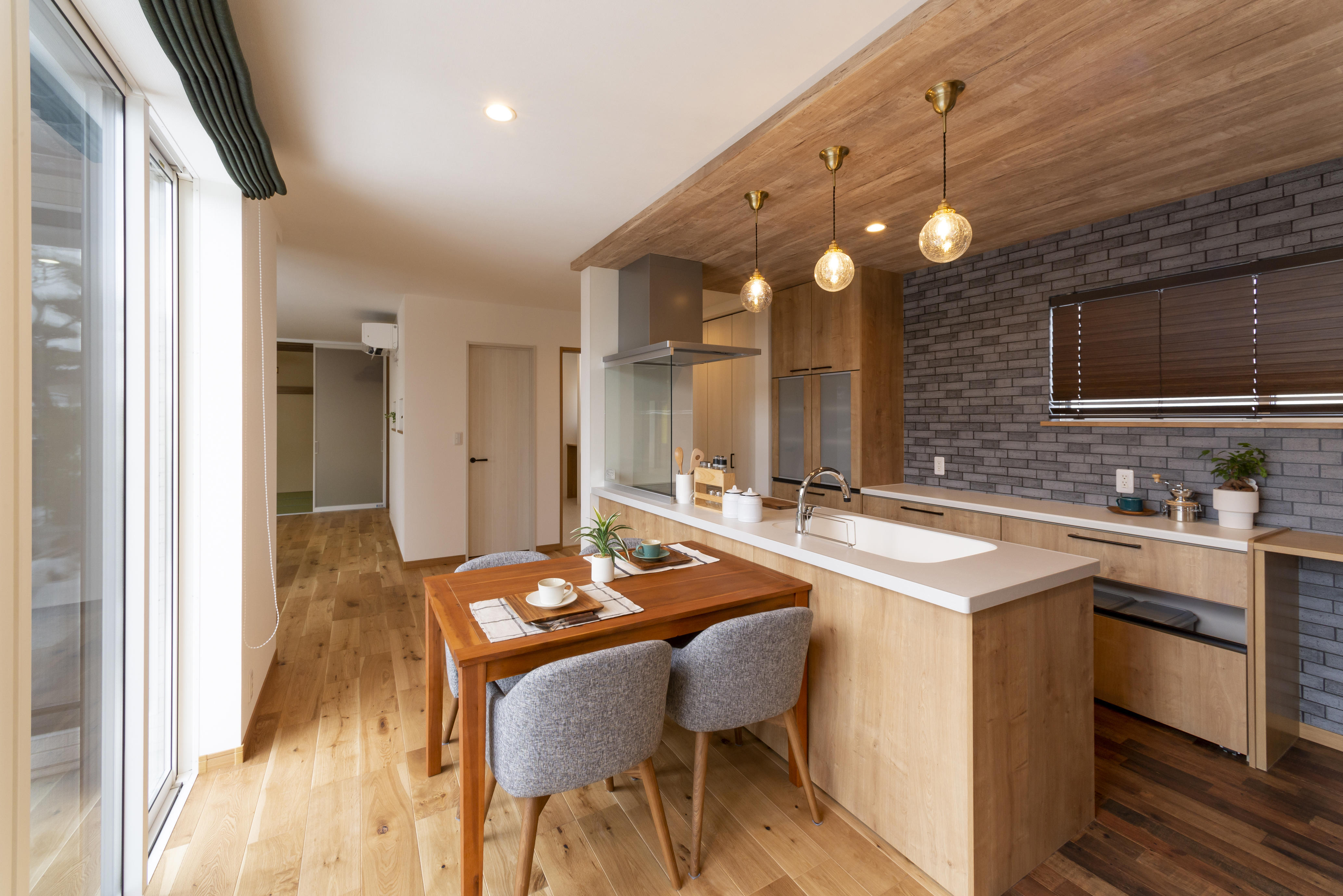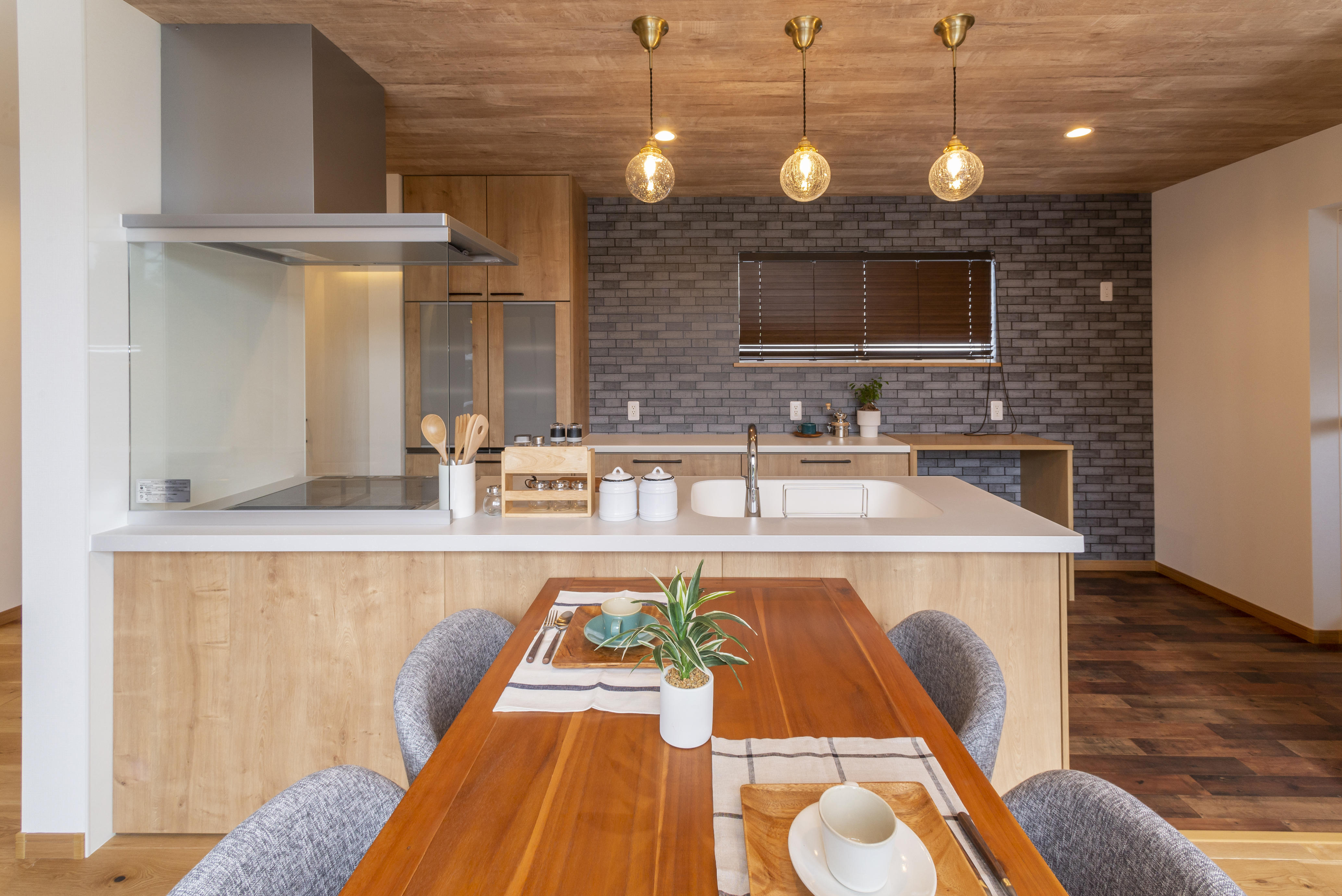 キッチンは奥様こだわりの照明と下がり天井で、カフェのカウンターをイメージしたキッチンに。壁にはレンガ調のタイルを貼って、カフェのような雰囲気を高めています。店舗用のクッションフロアを使用して、耐久性のある床になっていることもポイントです。
