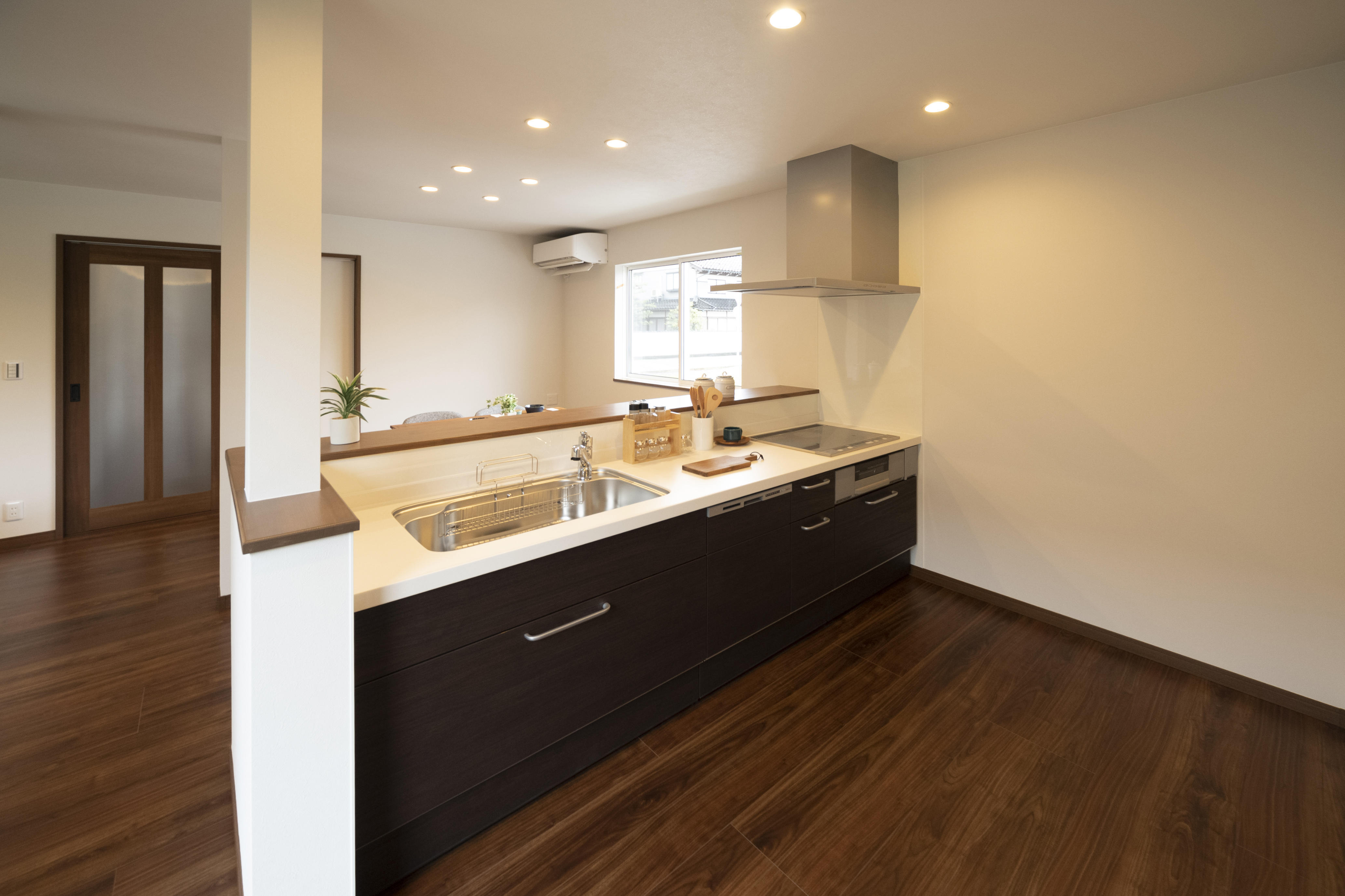 家族と触れ合える対面キッチン。施主様の身長に合わせて低めの設計にしています。