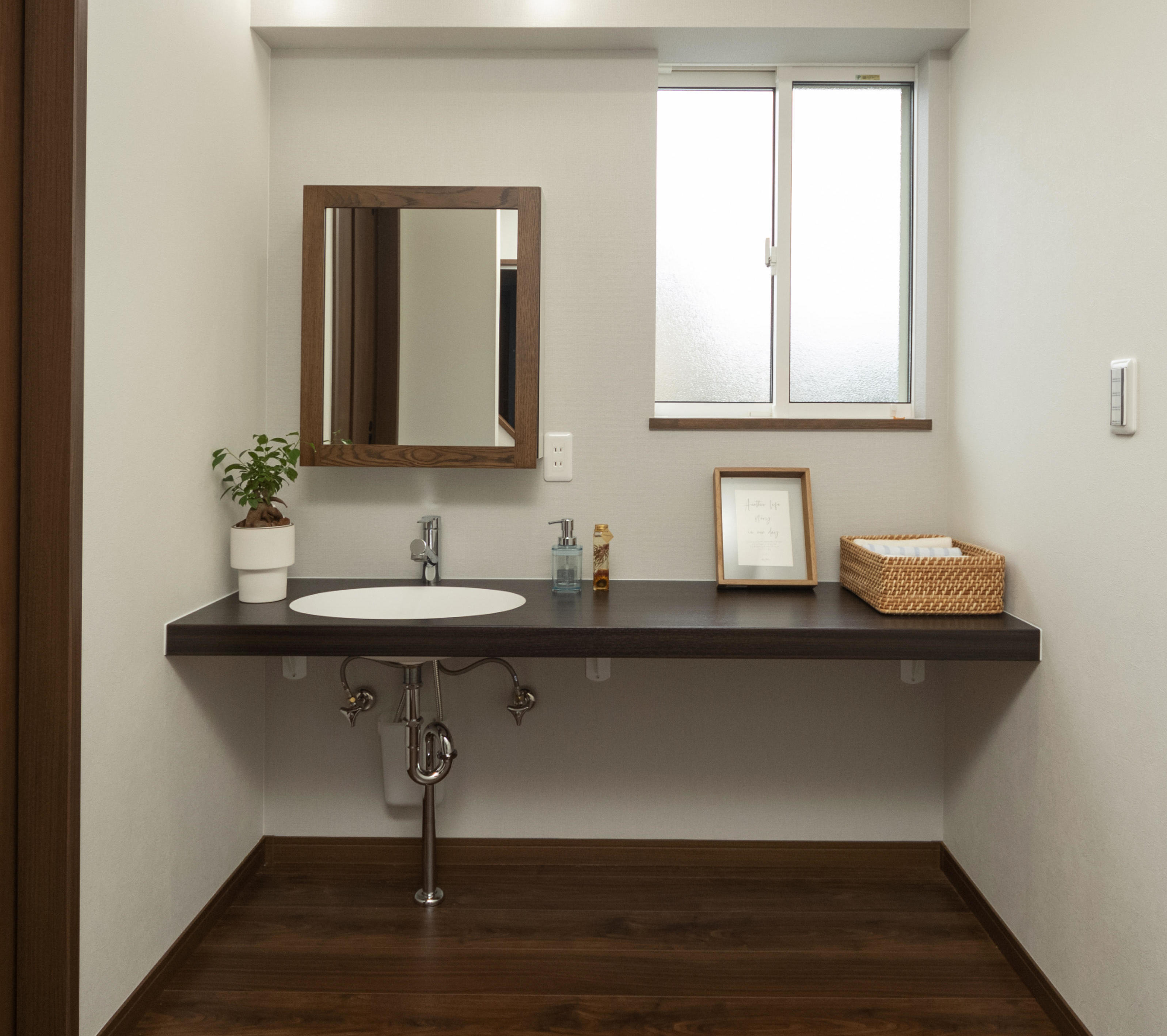 使いやすさを一番に考えた水回り。洗面カウンターは、車いすのままでも使用できる高さにしています。