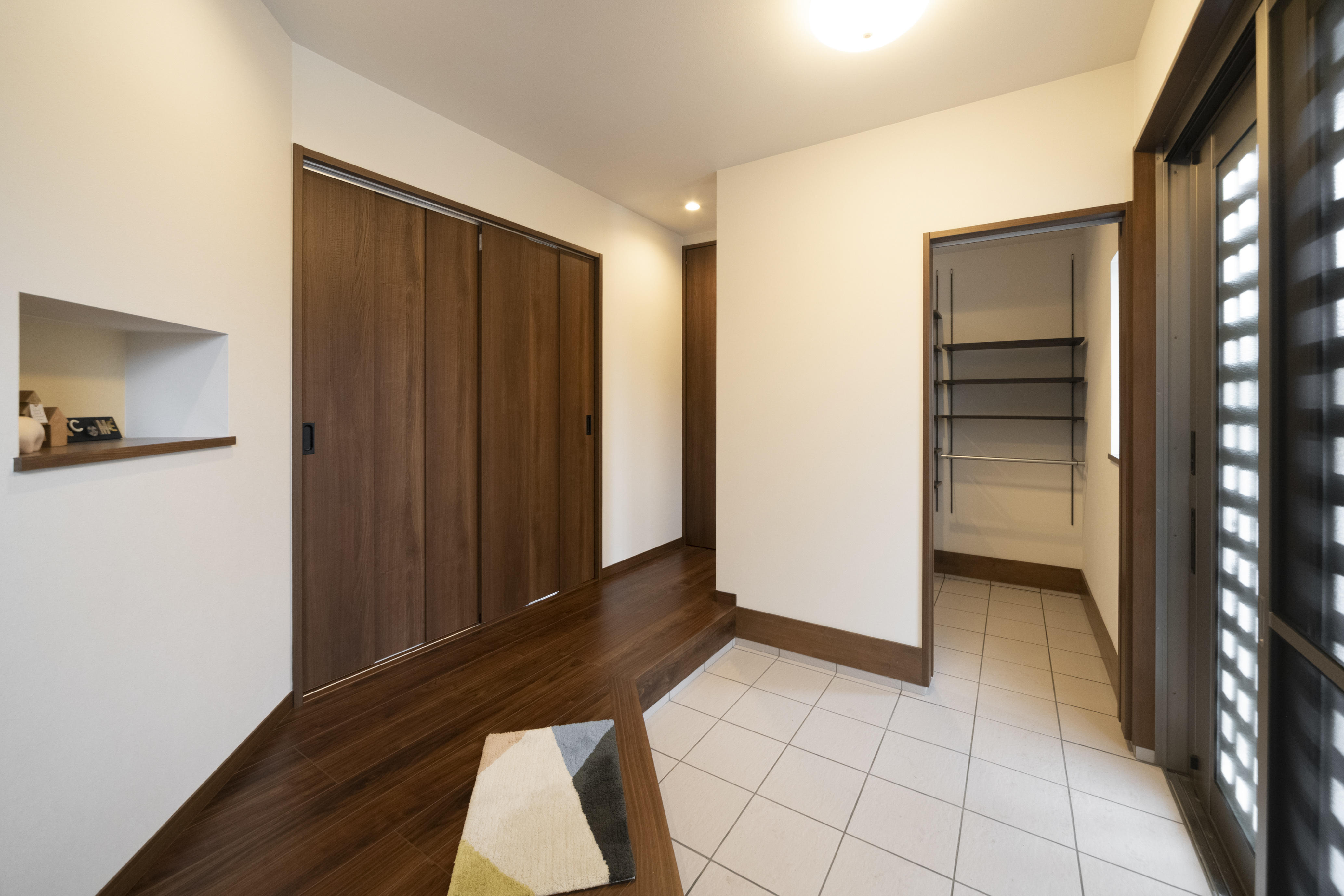 玄関の位置を変えると運気が上がるとのことで風水にもこだわった広々とした玄関になっています。玄関の隣にはシューズクロークを新設しました。シューズクロークは、コートや雨具なども掛けられるようになっています。