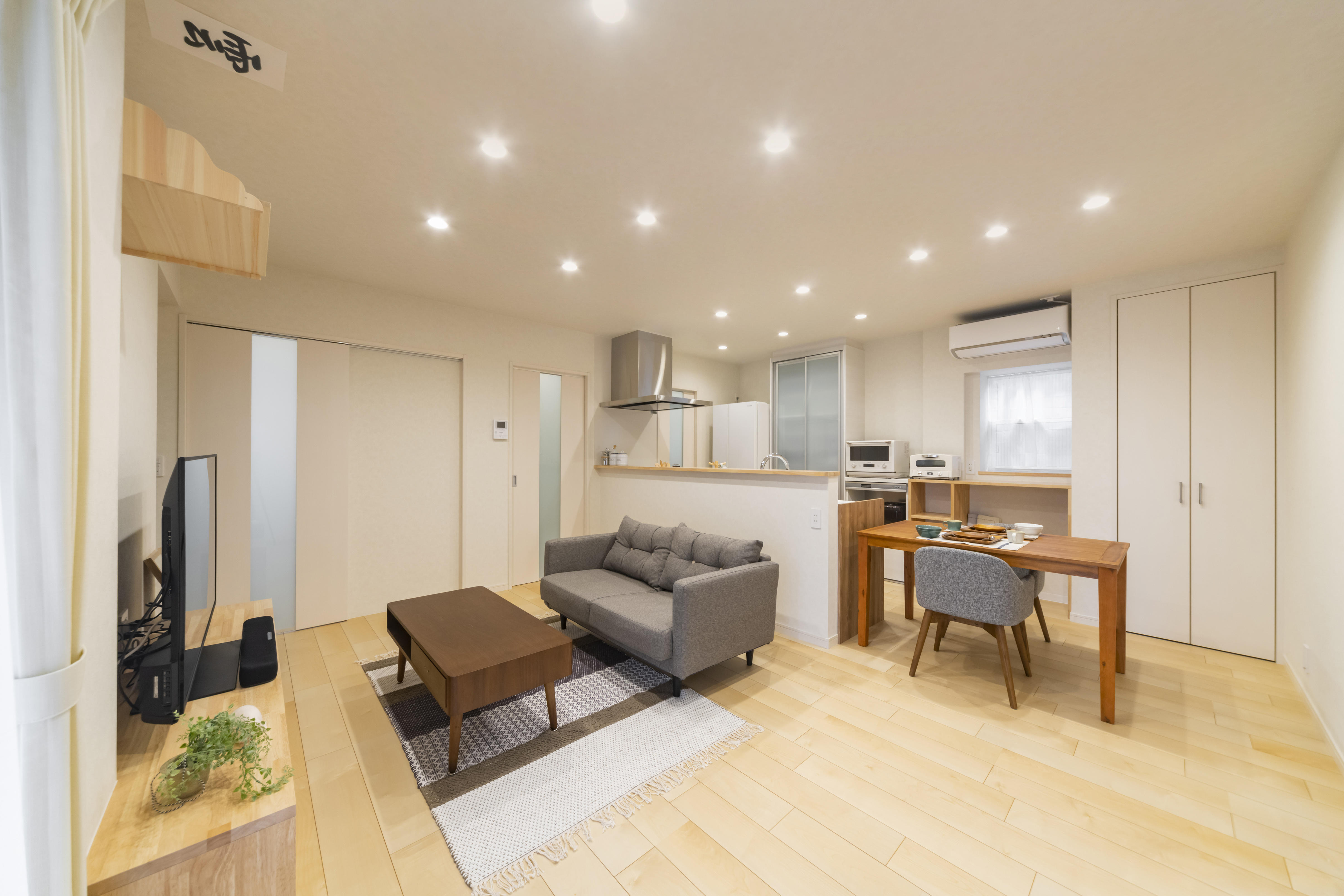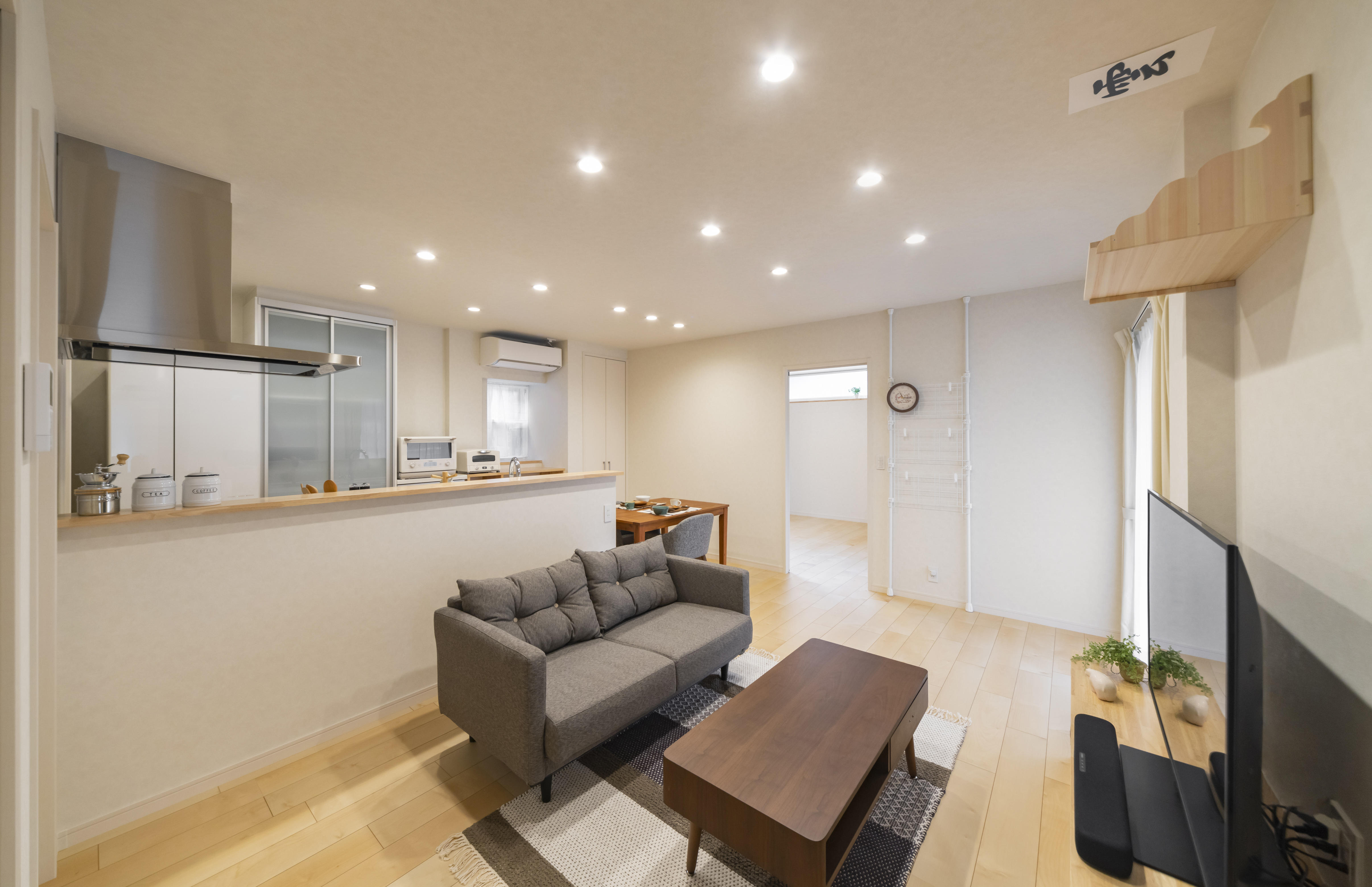 配膳効率を上げるため、ダイニングとキッチンは横並びのレイアウトに。リビング側から手元が見えないよう立ち上がりのカウンターを造作しています。キッチン後ろには造作の収納棚。施主様愛用の米びつに合わせて奥行きのサイズを調整しています。生活動線をコンパクトにすることで、水まわりにアクセスしやすいのがポイントです。