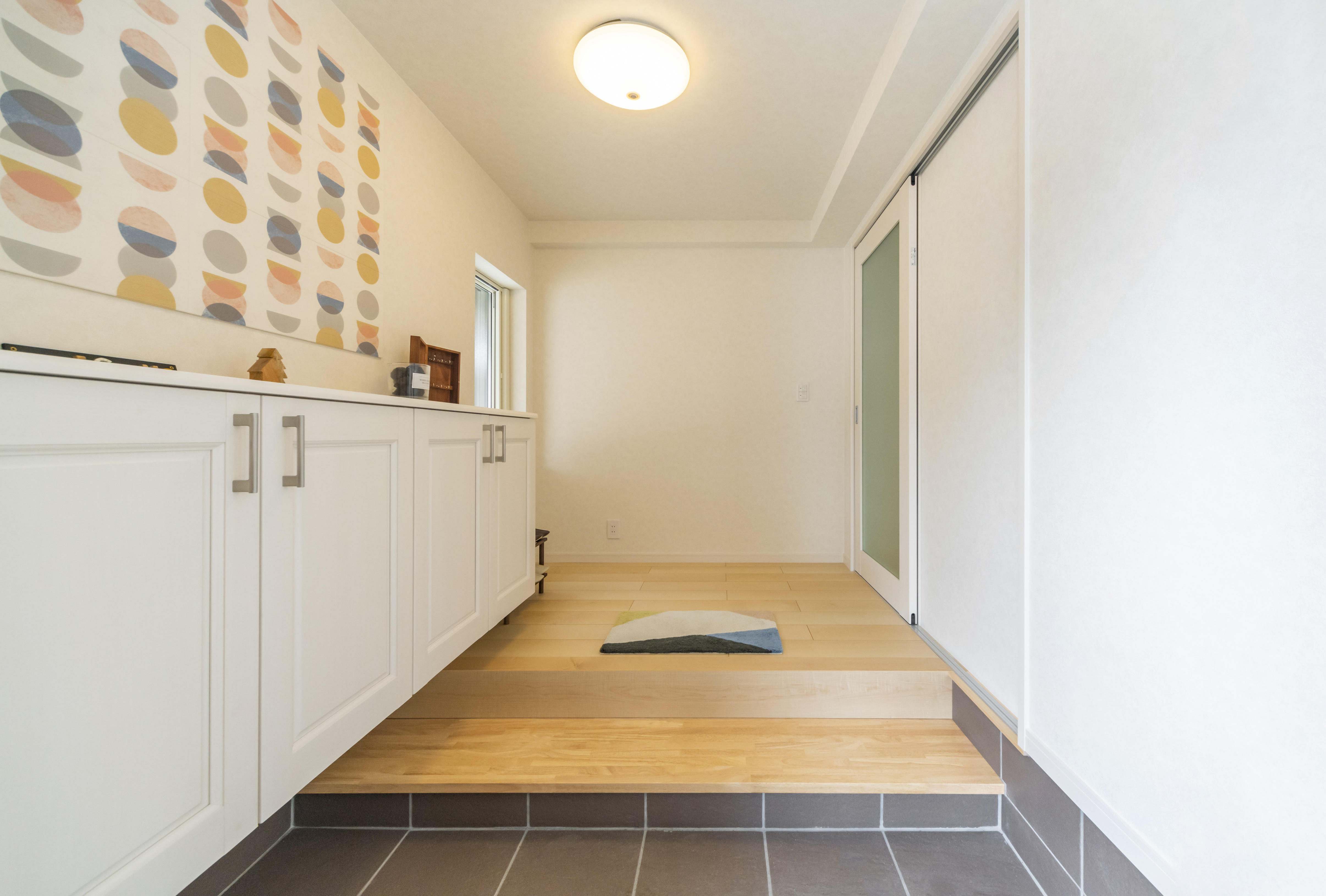 新しく設けた玄関。将来も見据えて、登りやすいように式台を取り付けました。壁には人気の『エコカラット』を採用。消臭効果があり、気になる玄関の臭いをを抑えることができます。また、掃除のしやすさや高さのある靴を置くことを考え、玄関収納には床から浮かせるフロートタイプを採用しました。