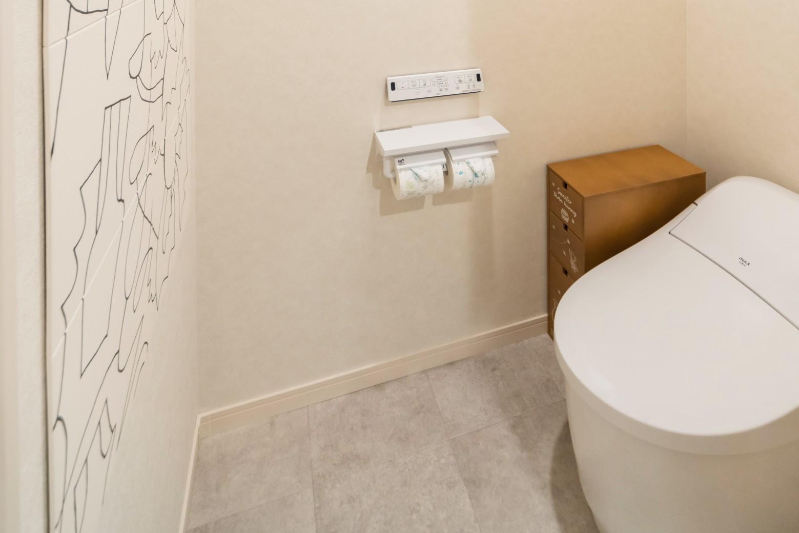 トイレは、小さなタンクが内蔵されている『タンクレス風』のトイレを採用。空間をスッキリ見せて広く使うことができます。消臭効果のあるエコカラットをトイレ室内の壁にも設置して、デザイン性をプラスしています。