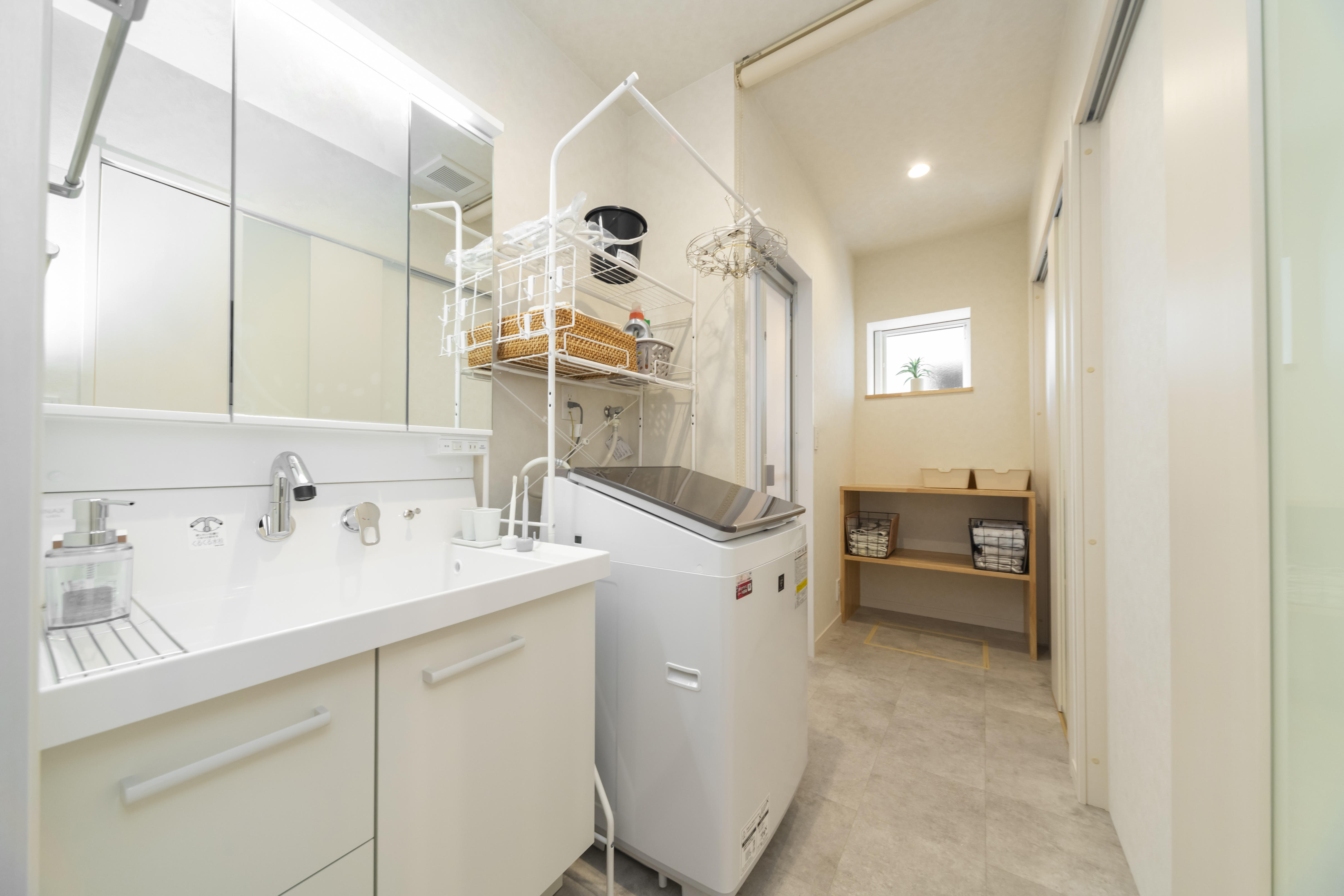 家事動線をコンパクトにすることで、水まわりへのアクセスがしやすくなります。落ち着いた色合いの浴室。浴室・脱衣室の間には、仕切りのためのロールカーテンを設置しました。来客時にはプライベート空間を隠すことができます。