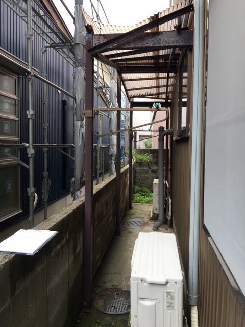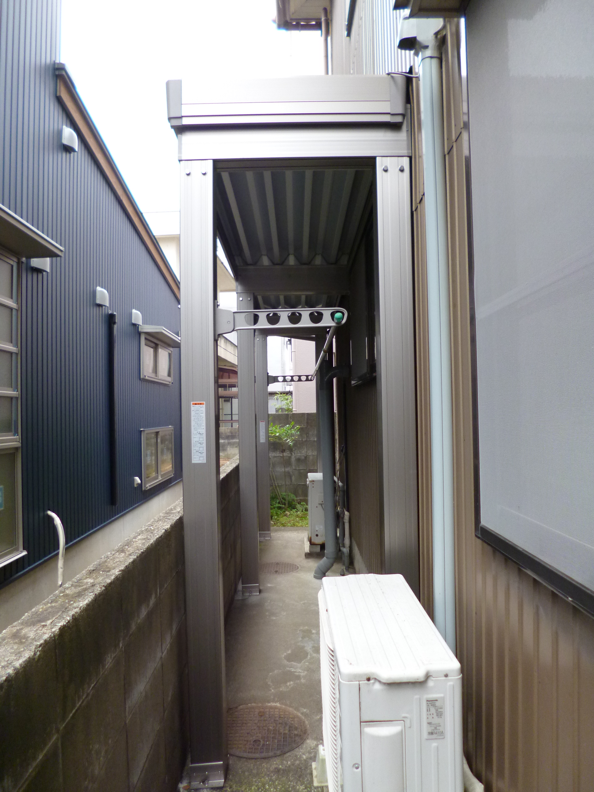 30年ほど前につくられた物干しスペース。長い年月で、傷んでしまい、ご相談を受けました。ちょうどお隣がご新築中ということもあり、積もった雪が隣地に落ちないよう、屋根の流れに配慮しました。北陸の変わりやすいお天気でも、安心してお洗濯ができる!とご好評です。