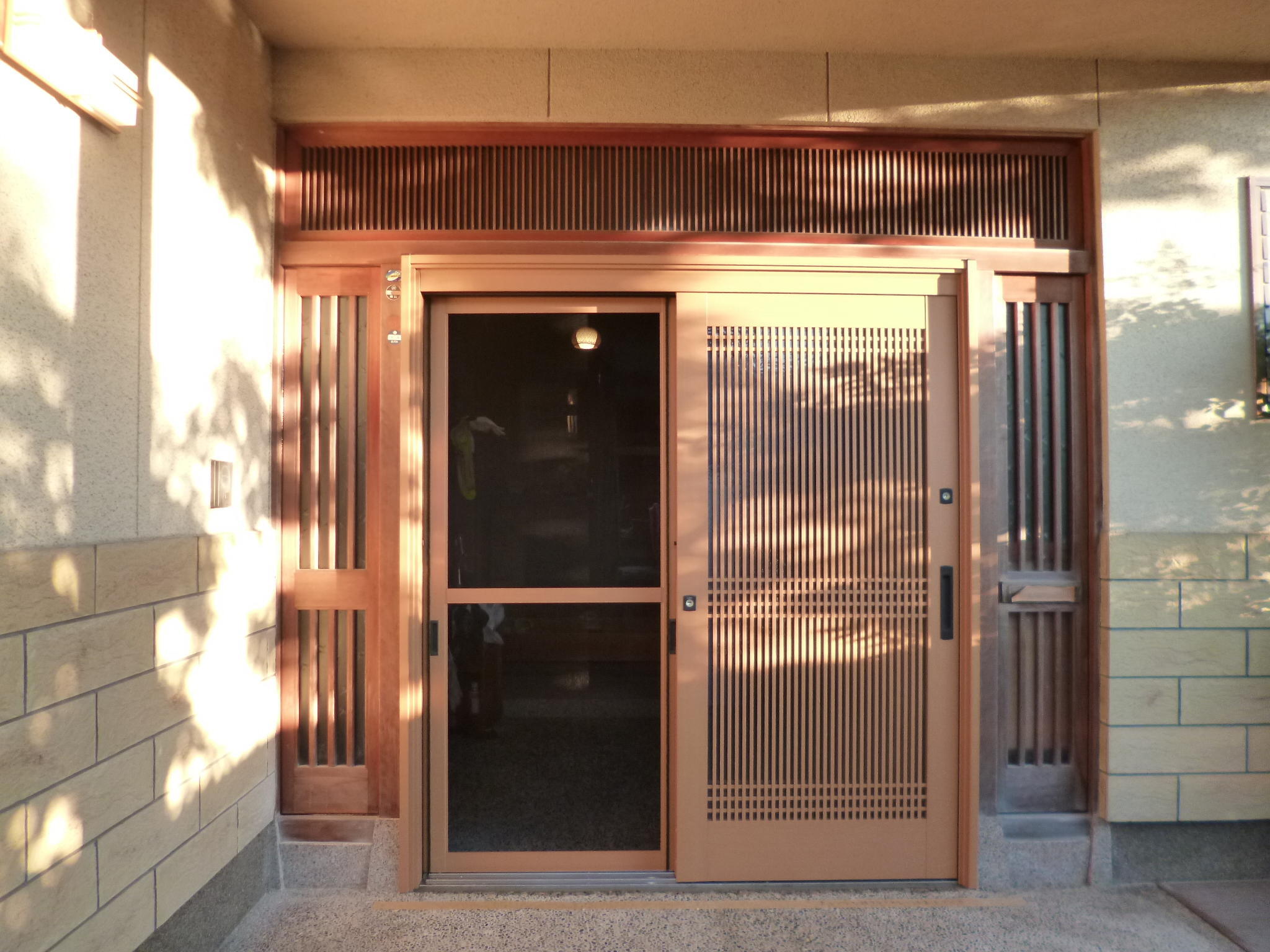 「木製の玄関引戸のすきま風が気になる」とのご相談から、引戸部分のみLIXIL「リシェント」に取替させていただきました。敷居の石も撤去して、段差も解消できました。