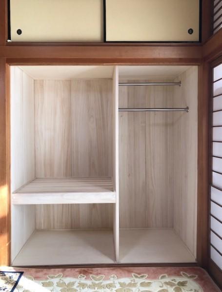 K様より「押入れをクローゼット化したい」というご依頼をいただきました。 来客用のお布団と、お洋服を入れたいとのことでしたので、調湿作用のある桐を使って仕上げました。 (天井と床はシナベニヤ)