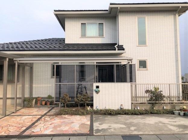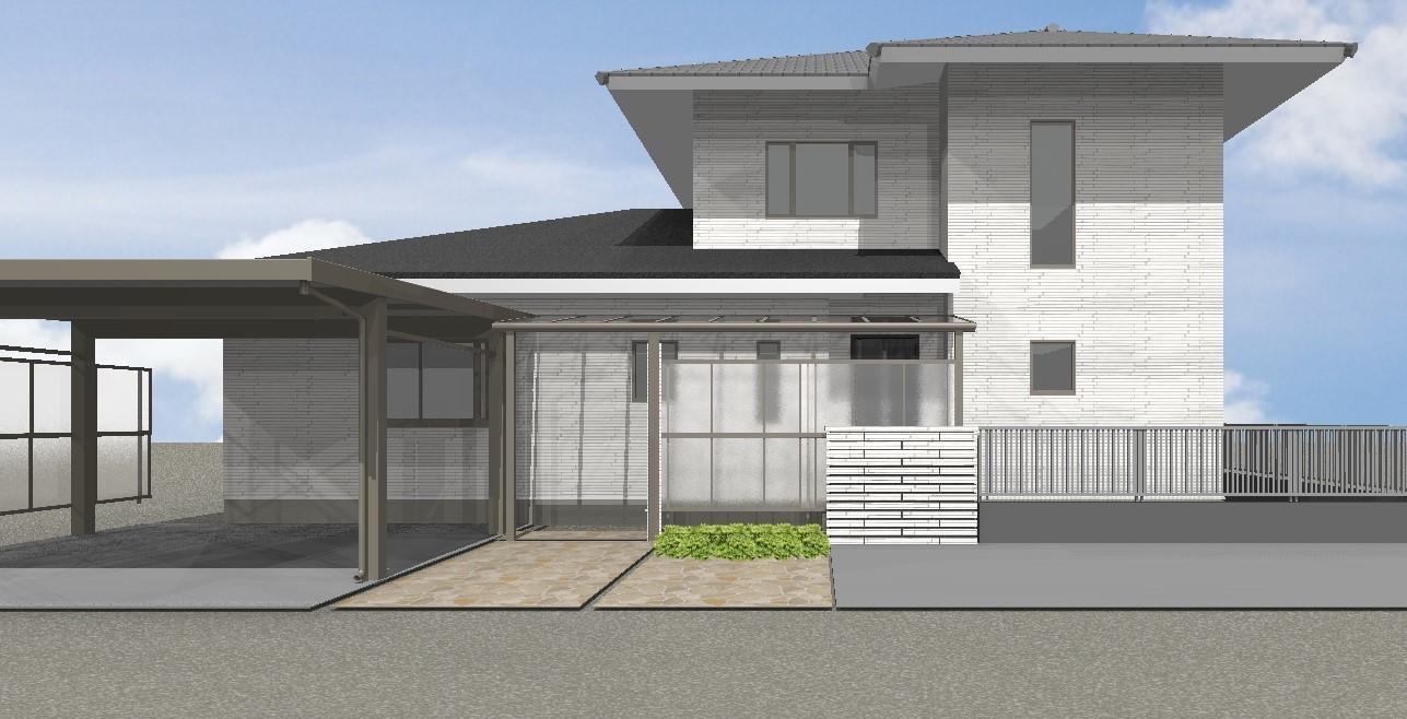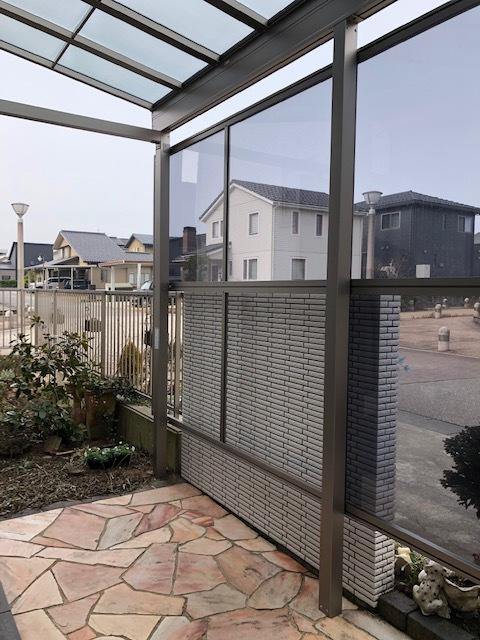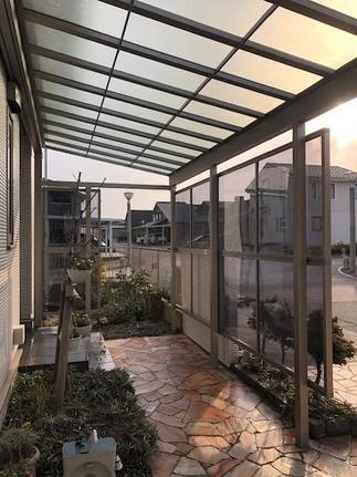 「風が強い日、玄関ドアが開閉しづらいのをなんとかしたいのと、アプローチに屋根を付けたい」とのご相談をいただきました。 そこで、LIXILのテラス屋根を、特注仕様でご提案。