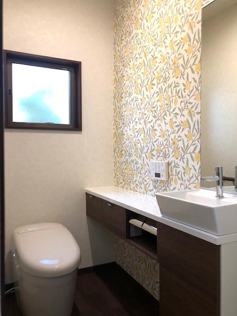 そこで便器と手洗いの位置を変更し、広々とお使いいただけるプランをご提案。 ウィリアムモリスのクロスを一面に貼って、明るい空間に♪