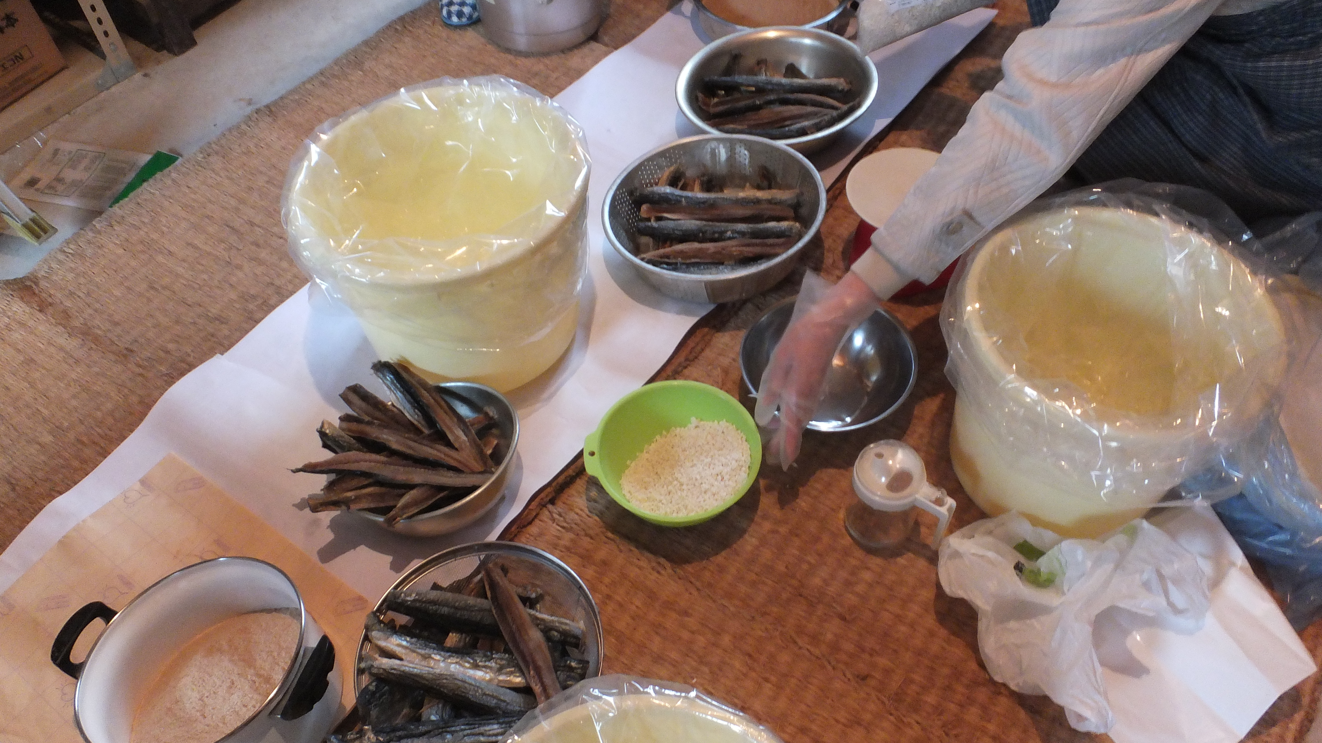 北海道の身欠きニシンを米汁にひと晩漬け、鱗をとり水気を取ったニシンに糠、麹、鷹