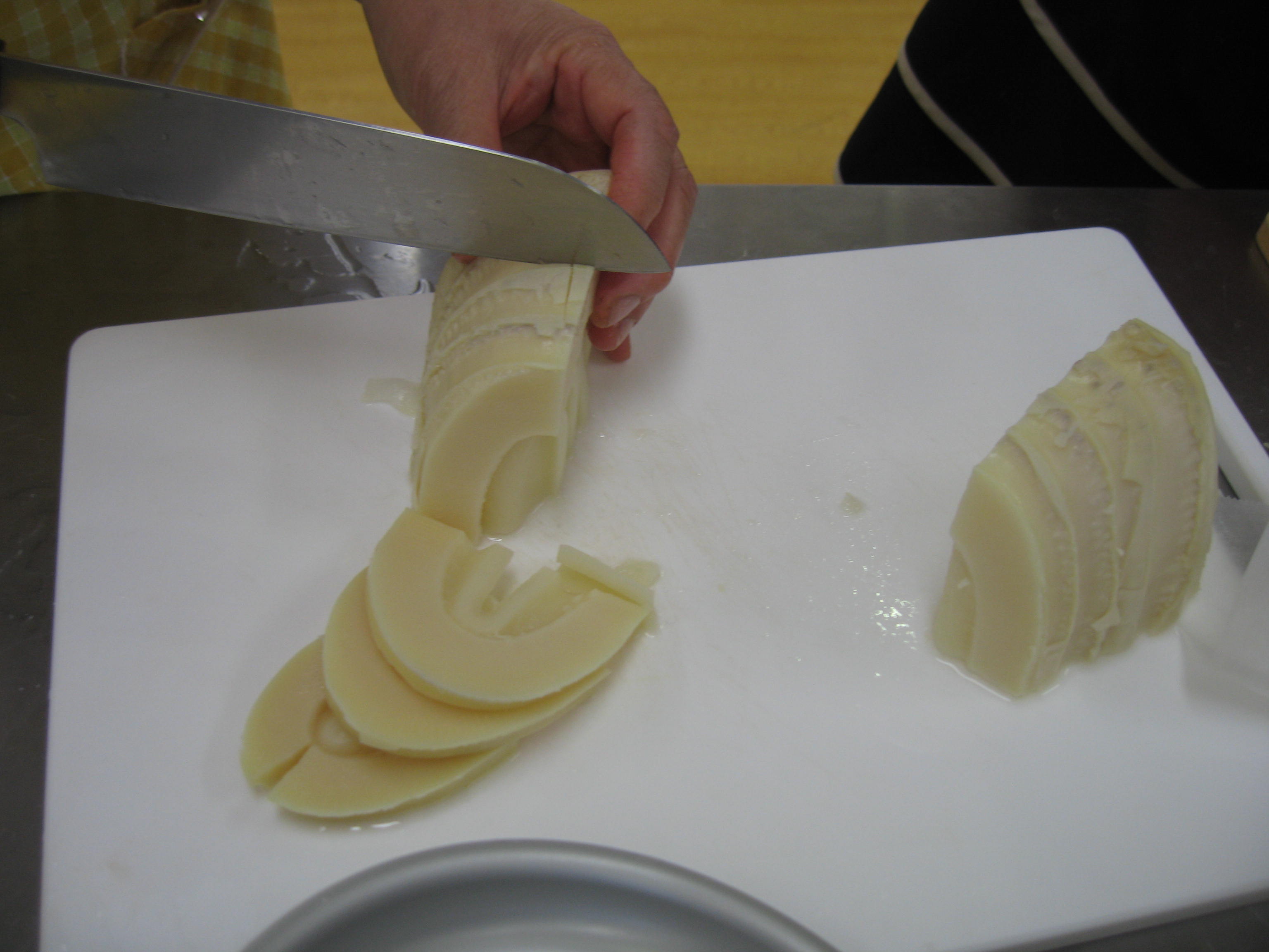 茹でた筍を5mm厚さ切り、浅く格子の切り込みを入れる。
