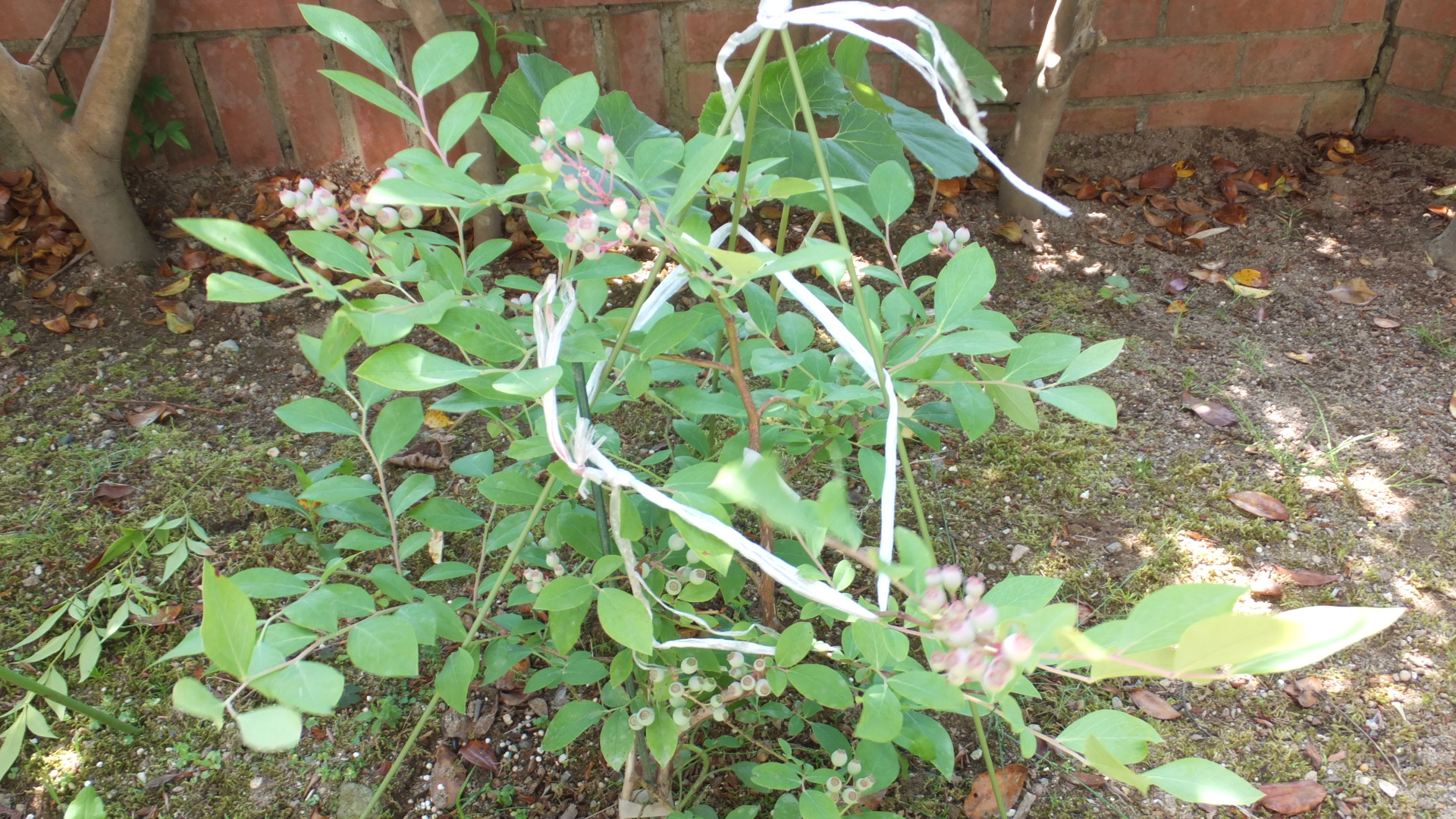昨年植えたブルベリーの木ですがまだ盆栽のように小さい。だが頑張って小さな実を沢山付けている。