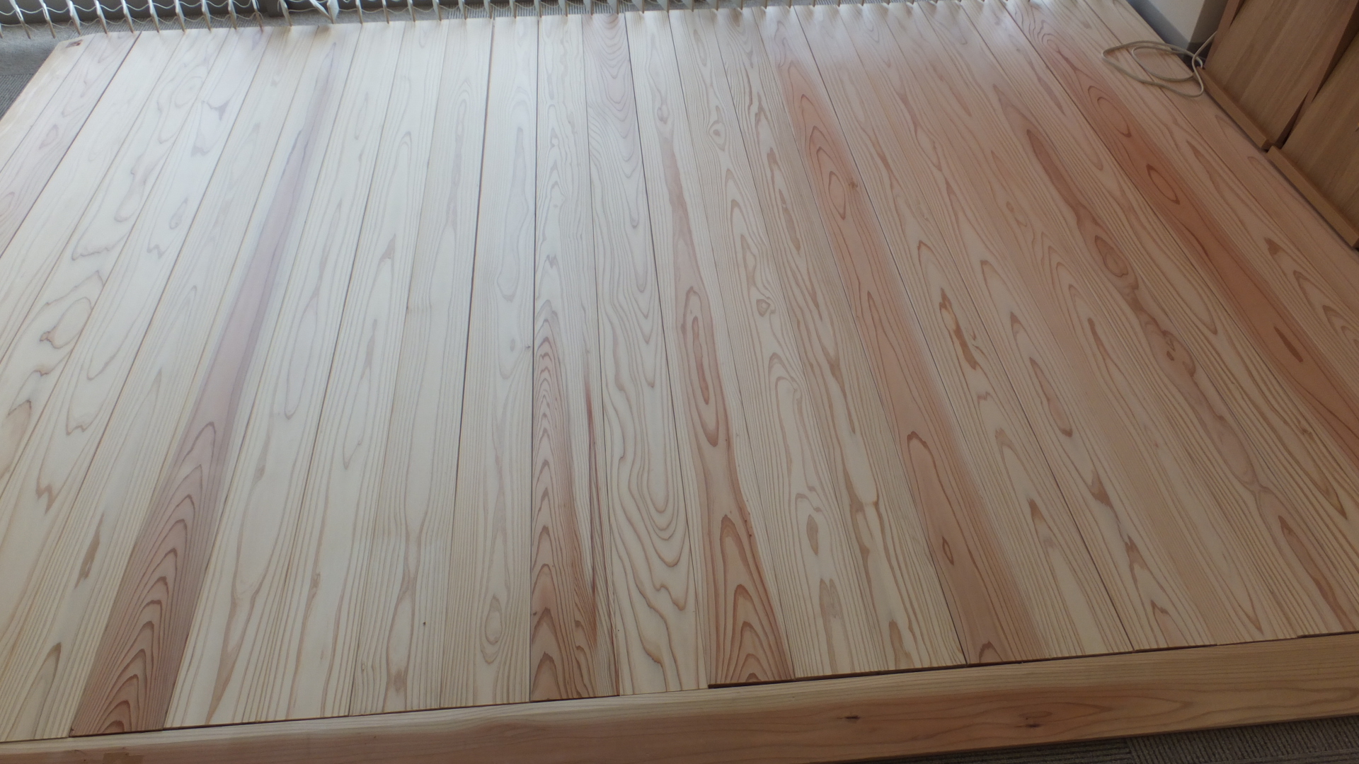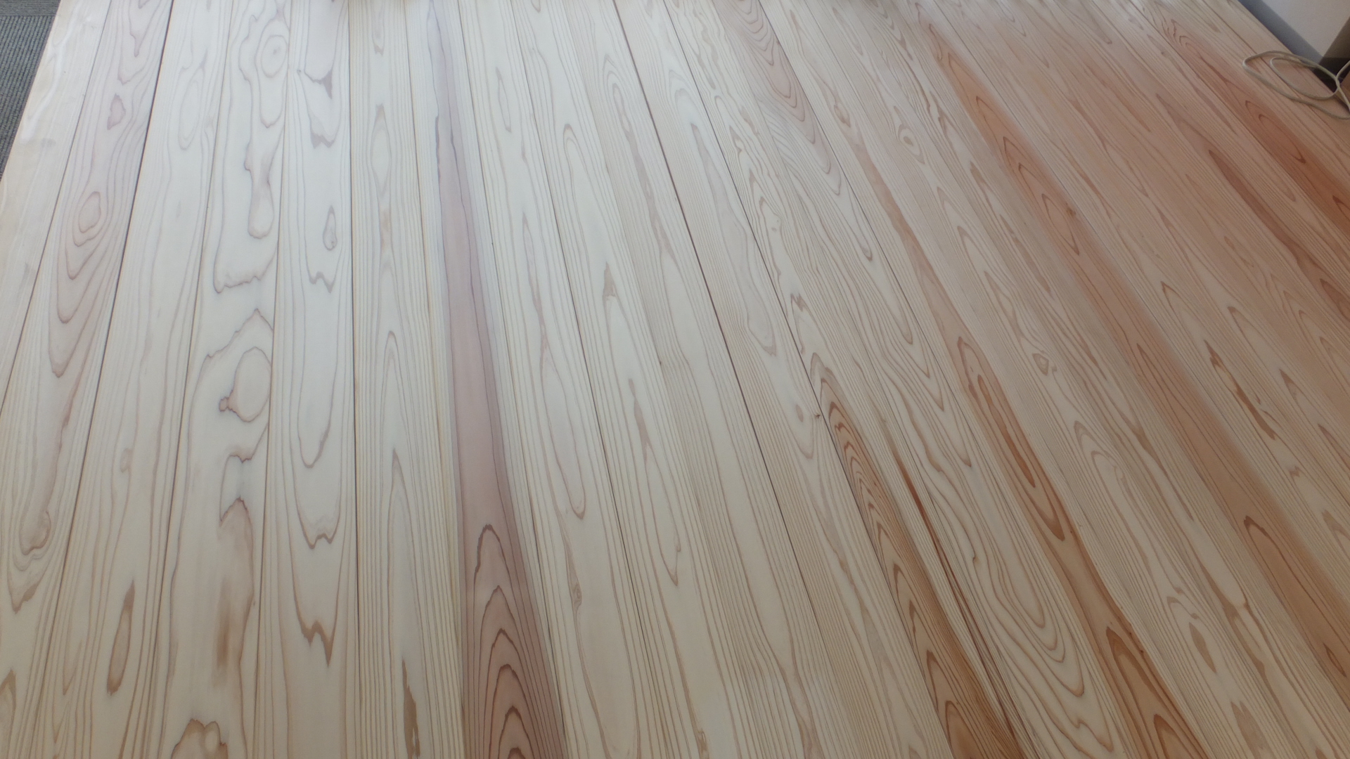 敷いた床板は杉板を圧密加工して年輪の違いから杉独特の夏目と冬目と凹凸を作り木目を足の裏で感じられとても心地良いものです。