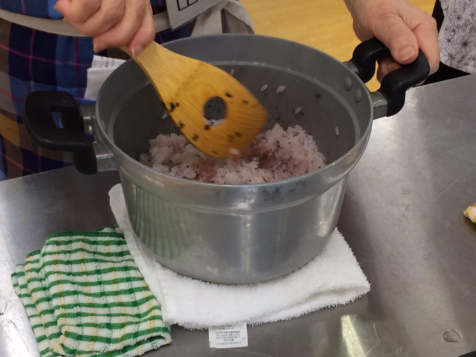 ↑刻んだ金時草を入れて炊くと、きれいな赤いご飯になりました。