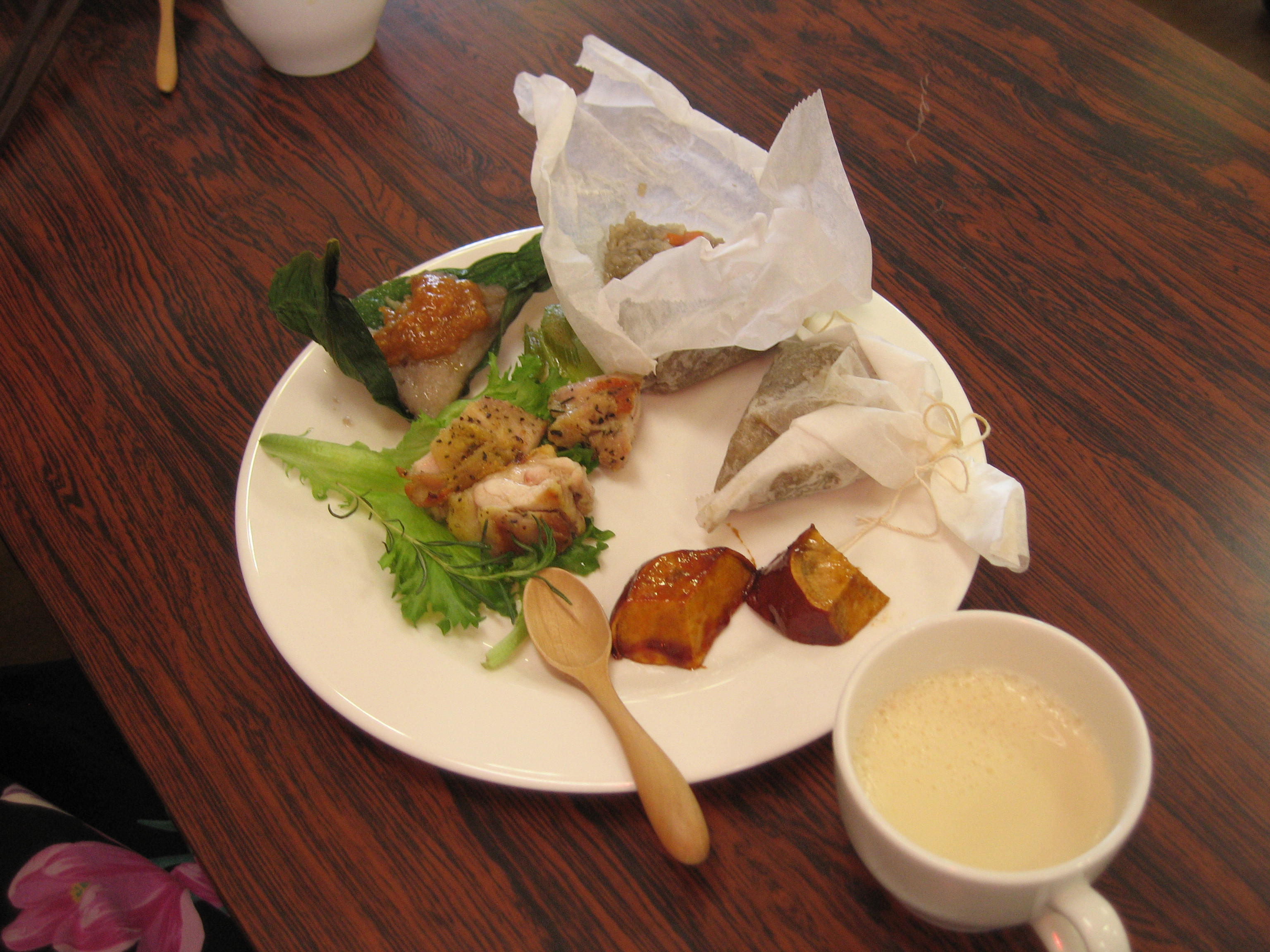 今回のメニューは中華ちまき・チキンの香草焼き・蓮まんじゅう・大学いも・豆乳プリンでした。