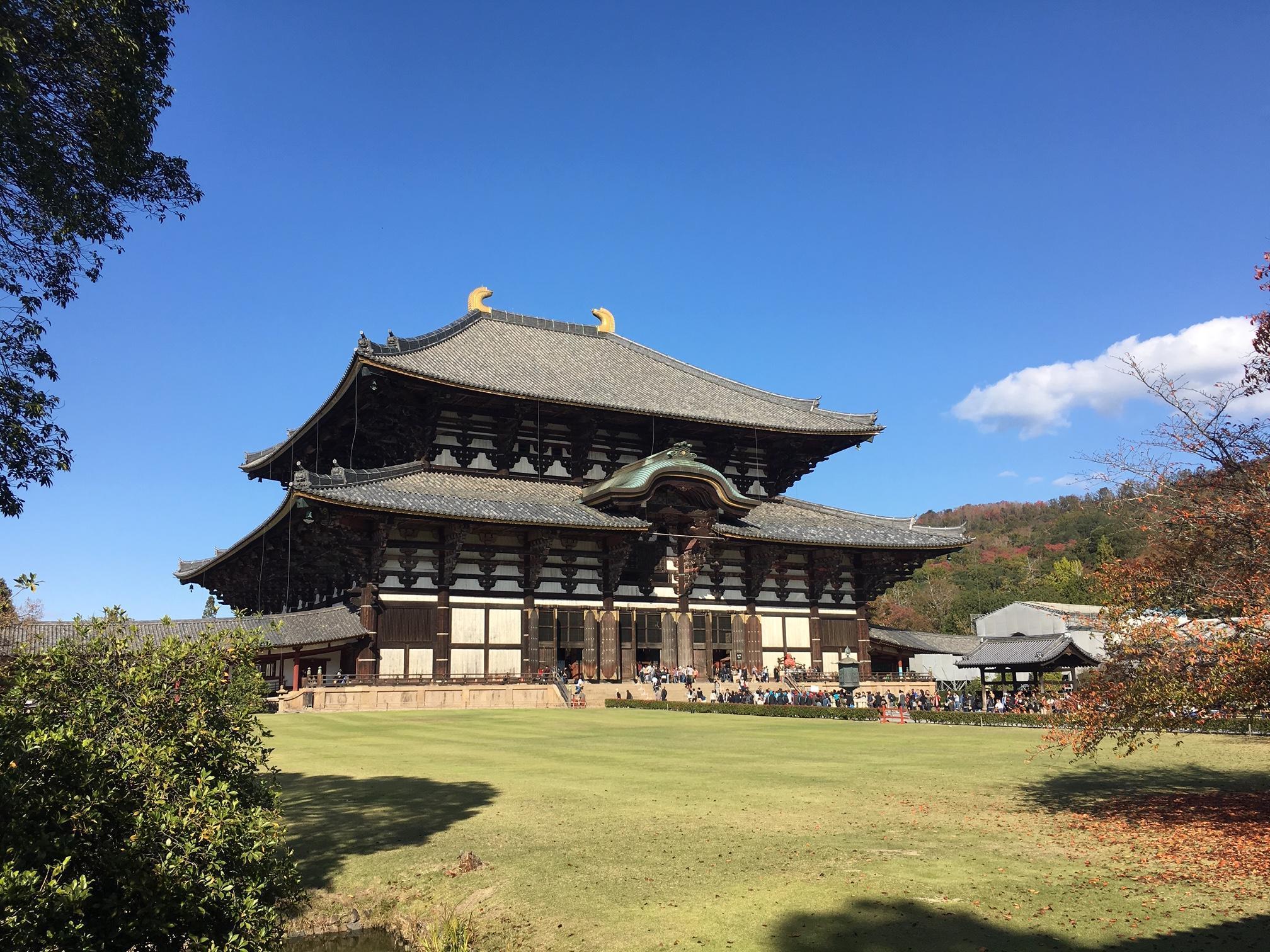 秋晴れの東大寺本堂です。まるで絵はがきのような青空ですね。