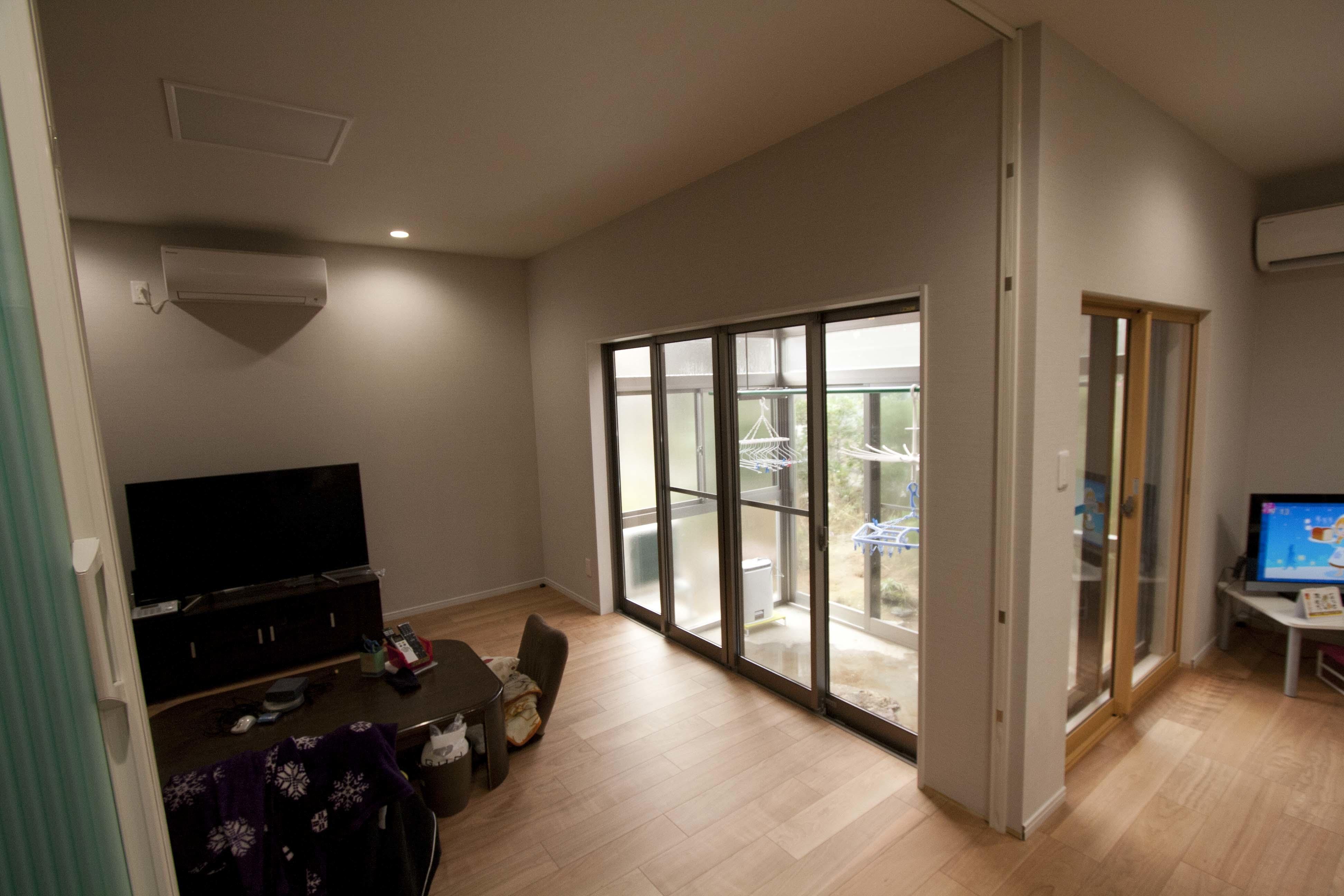 ↑リビングにはまだソファが置かれていませんが、平面形状がL型のLDKのリビングの入り隅にサンルームを配置しました。空間的にリビングが広がったようで狭く感じなくなったとFYさんに喜んでいただけました。