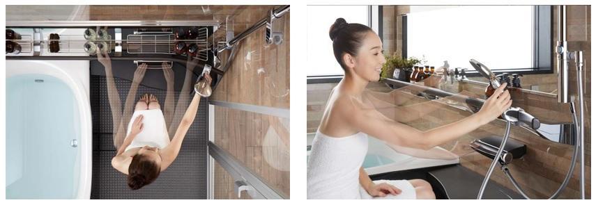 座ったままで水栓・シャンプーなどに楽に手が届き、バーのすきな位置に