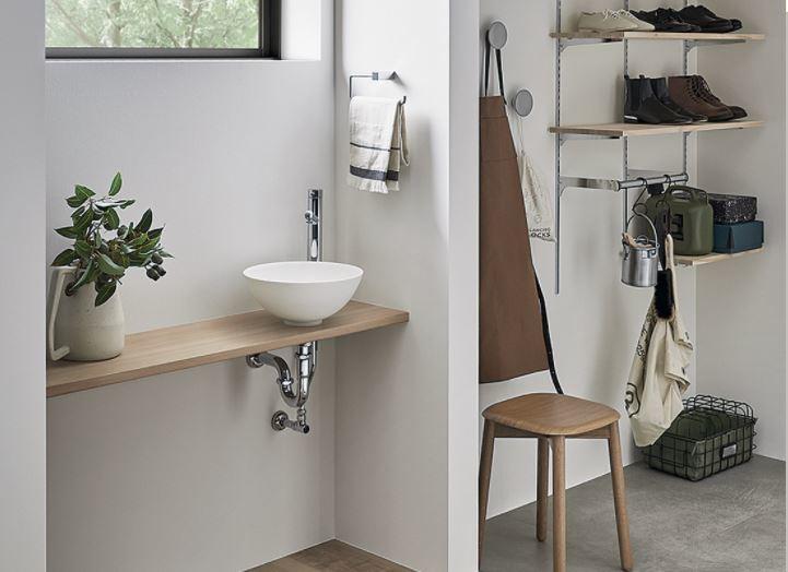 玄関などの狭い空間にもコンパクトに納められる洗面台です。