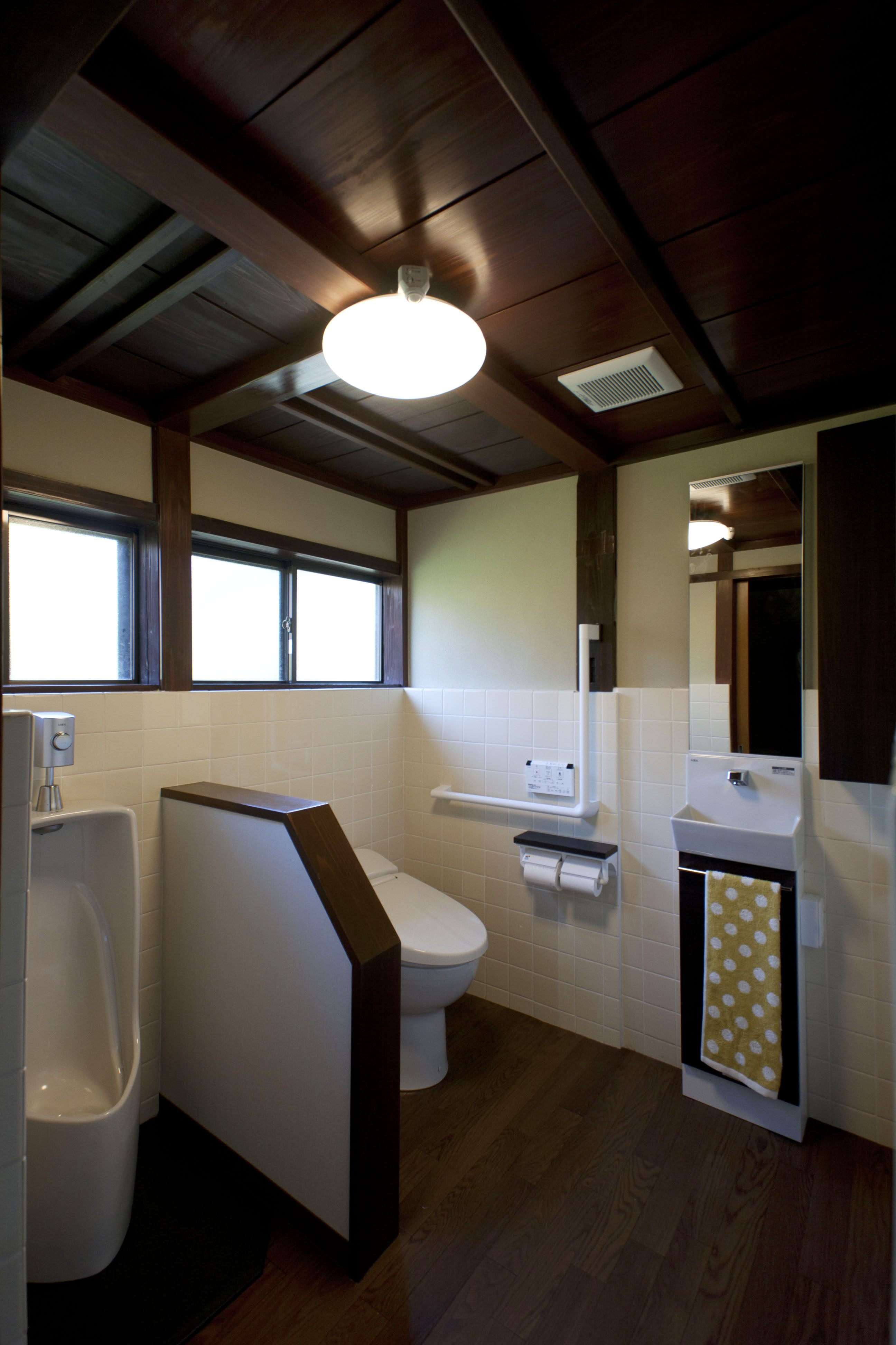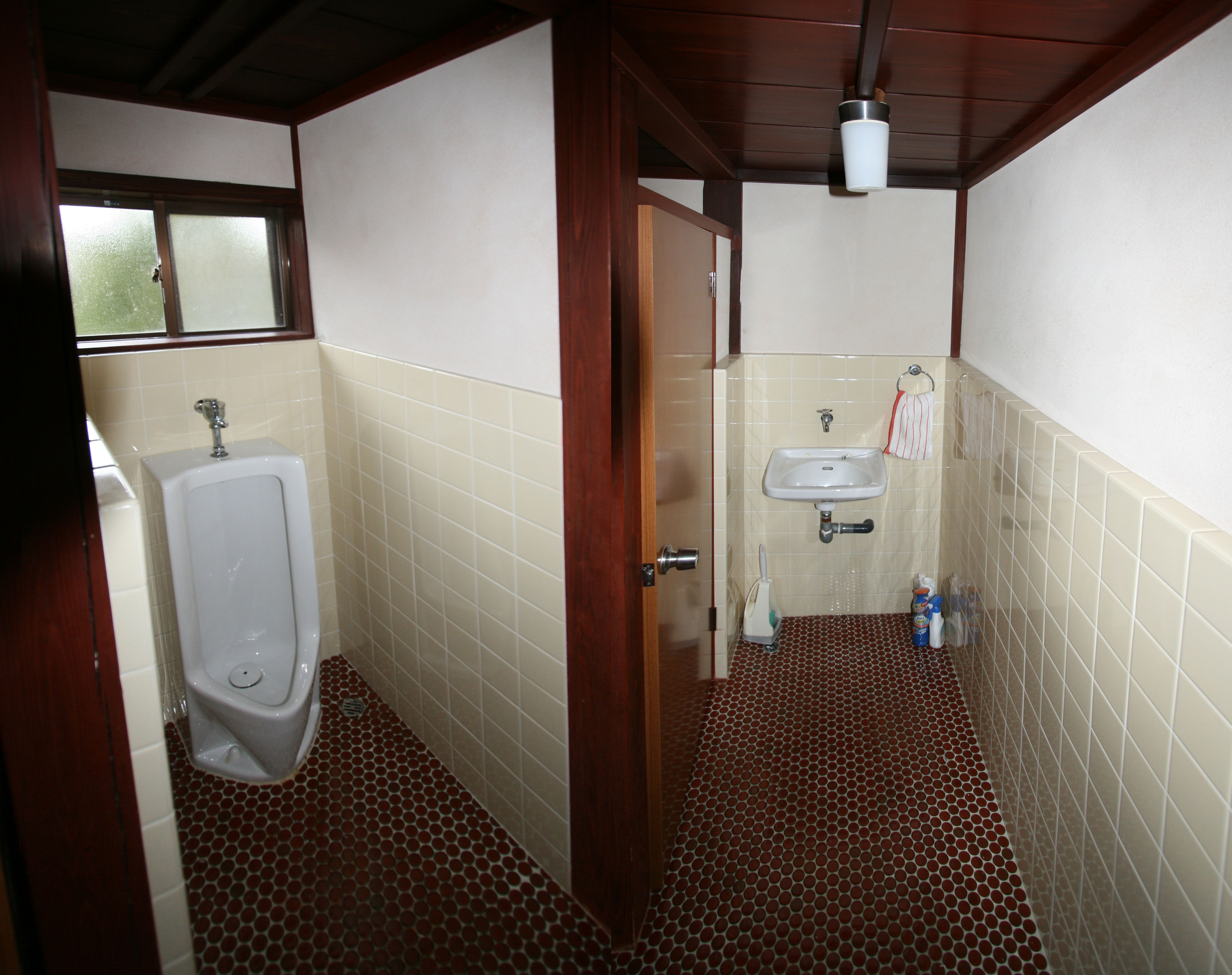 この建物は元々古民家を移築して建てられたもので、柱梁はケヤキで作られています。 竿縁天井を含めた表面の仕上げは全て漆です。 腰にはタイルが貼られていましたが、 建てた時の佇まいをなるべく踏襲しながら改修しました。