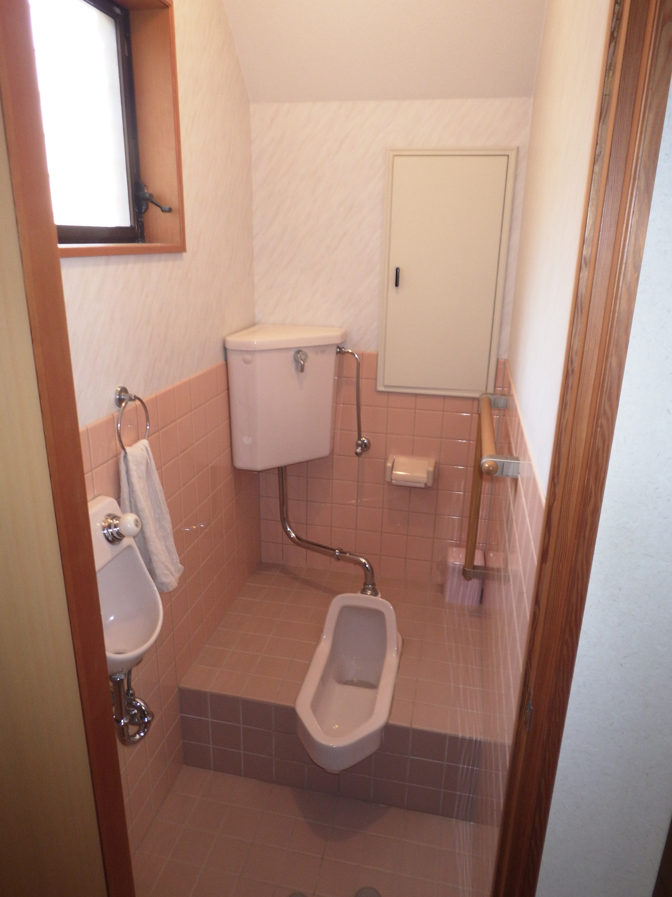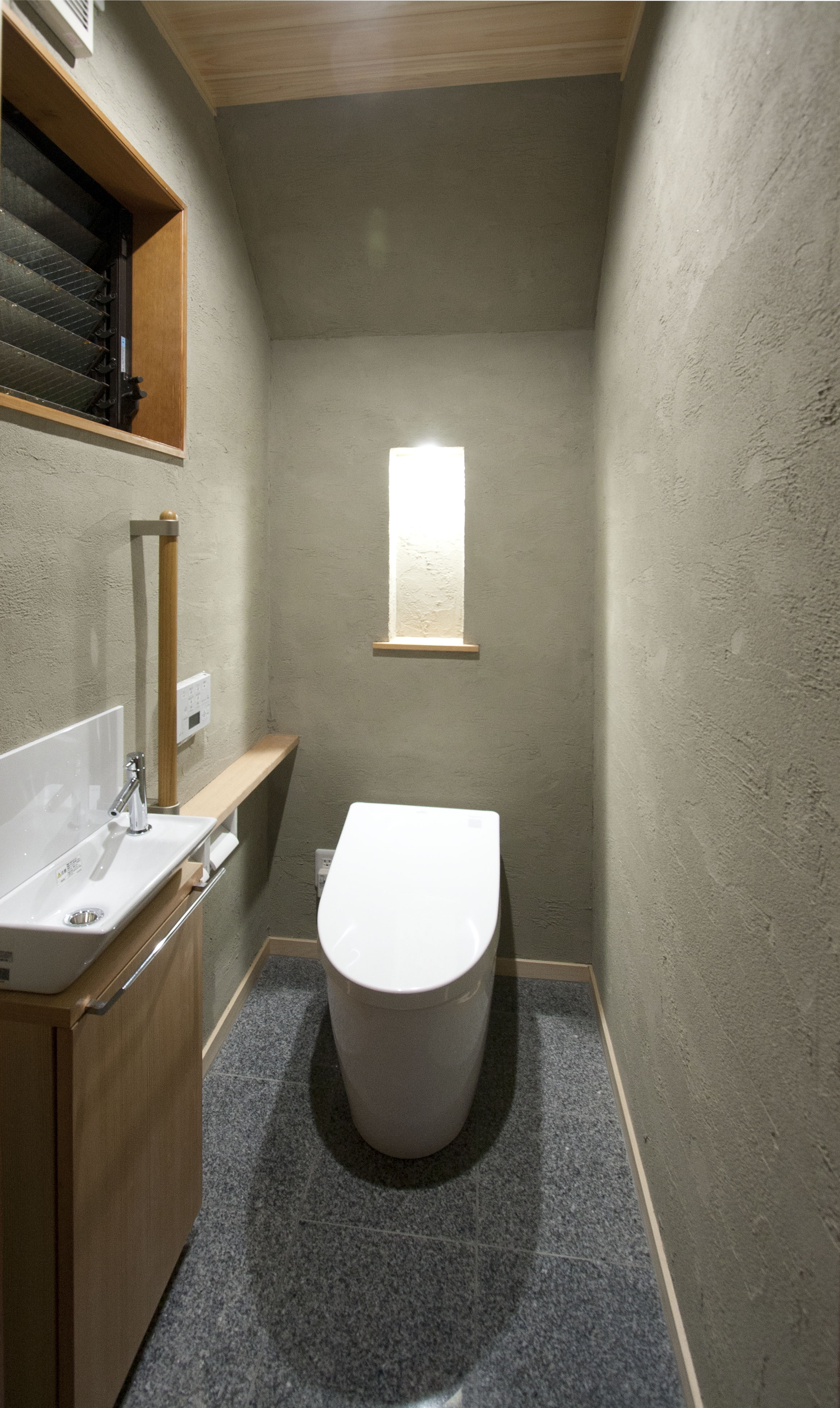 KT様邸は、数寄屋風の純和風住宅なのですが、なぜかトイレだけ異空間でした。 様式美もさることながら、和洋折衷トイレで使い勝手も決してよくありませんでした。 KT様は、意を決して純和風のトイレが欲しいとのことで、きれいでかっこいいトイレを目指しました。 床は、本御影石。壁は珪藻土を含む聚楽壁。天井は桧で、その他収納やカウンターの造作は松を使用しています。 この、数寄屋風のトイレにはお客様も納得されて、いつも快適に使用されています。