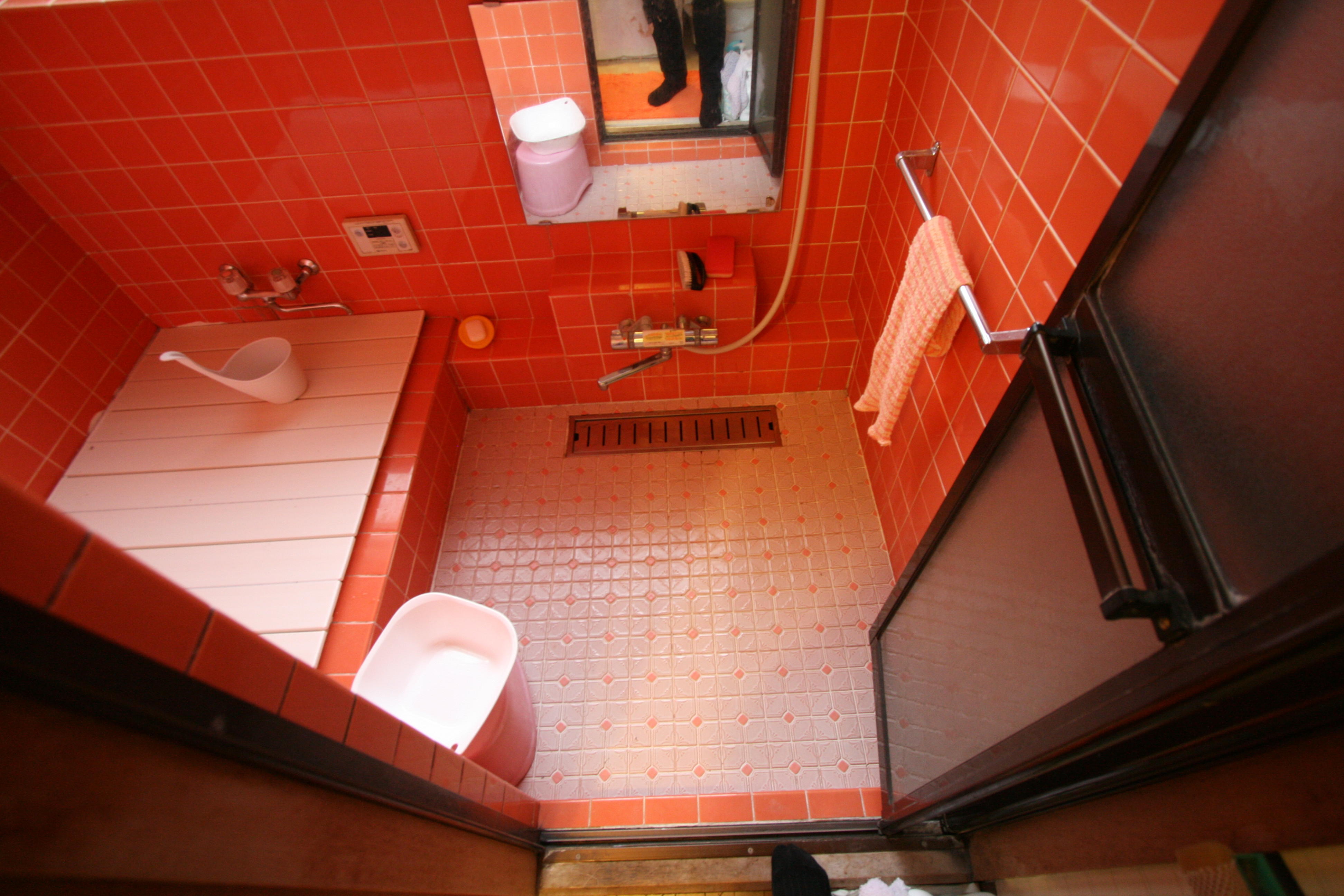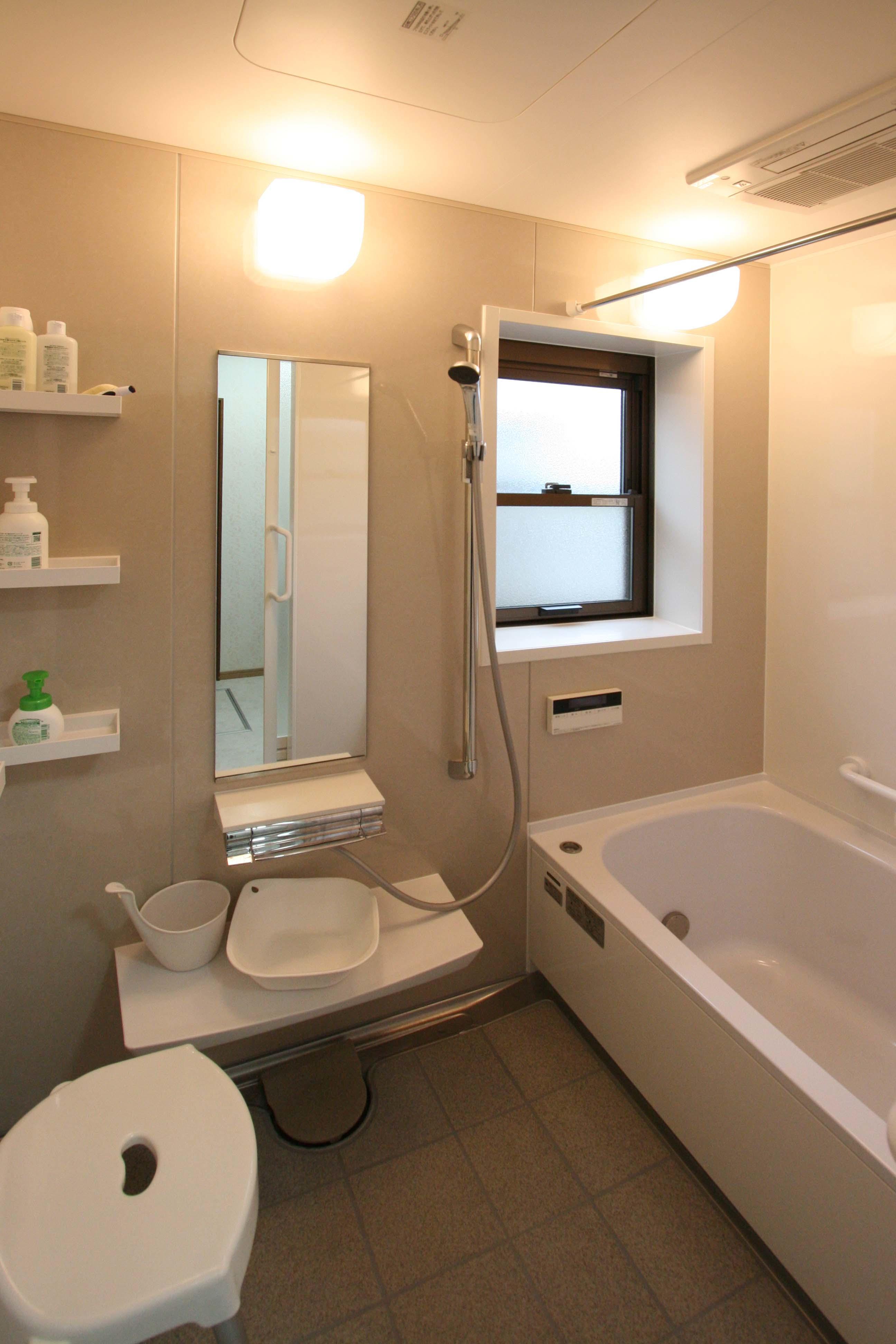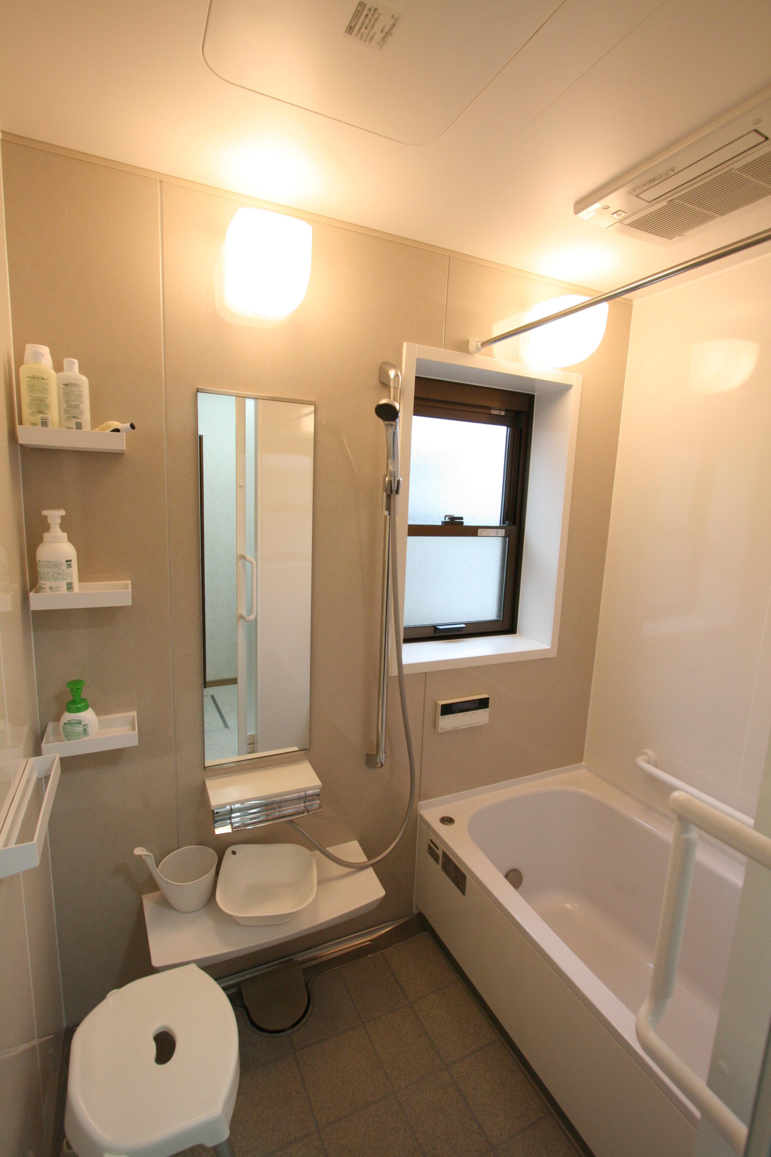 浴室が和風住宅のモジュールと合わなかったため、特別サイズにオーダーしました。これによって、通常ですと1216サイズの0.75坪のユニットバスになり以前の浴室より狭くなってしまうところを以前と同じサイズの浴室の広さを確保できました。また、出入り口も片開き扉と併せて狭かったのですが、引き戸にして広く開口を取ることができました。以前よりずっと快適に浴室に入ることができるようになりました。