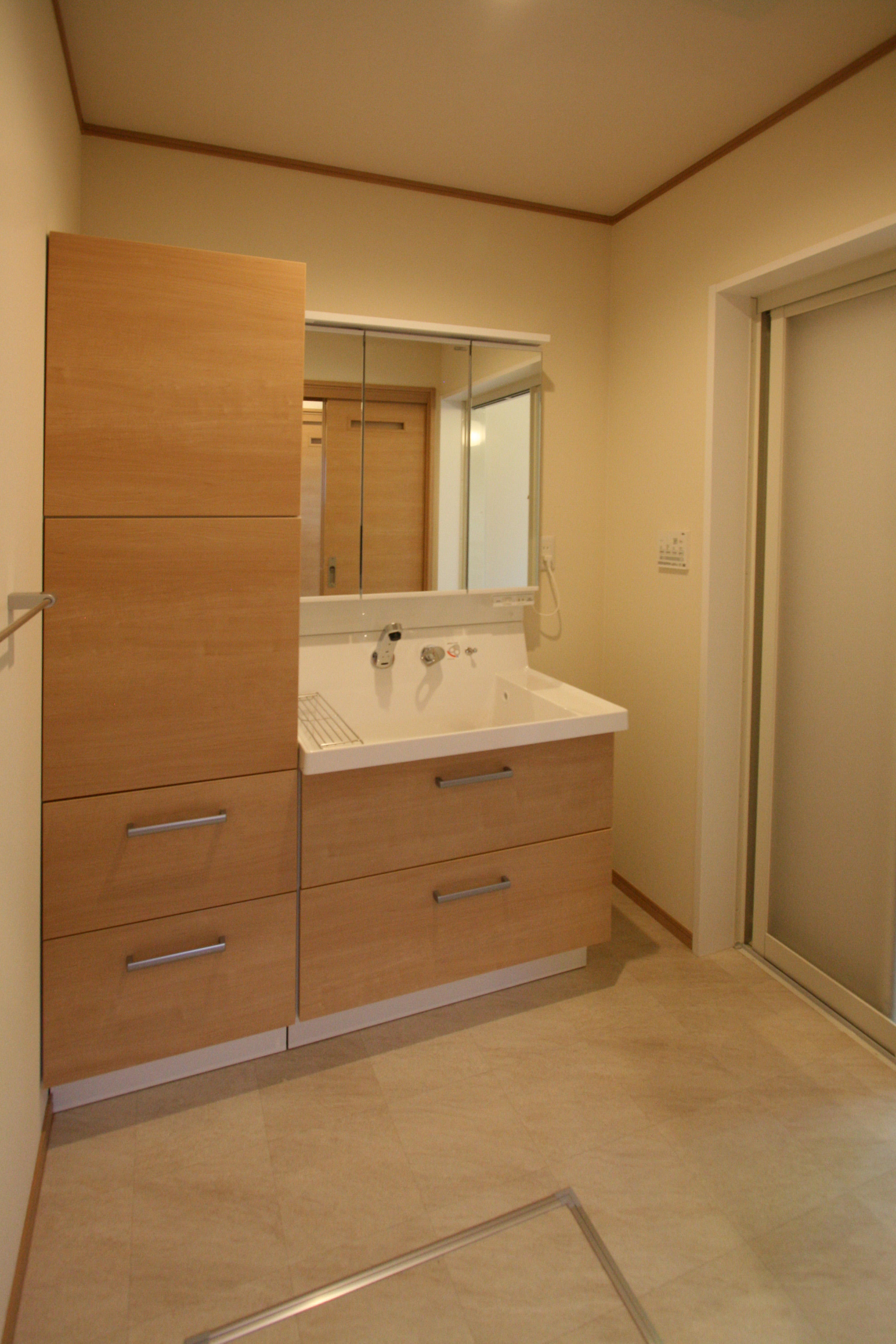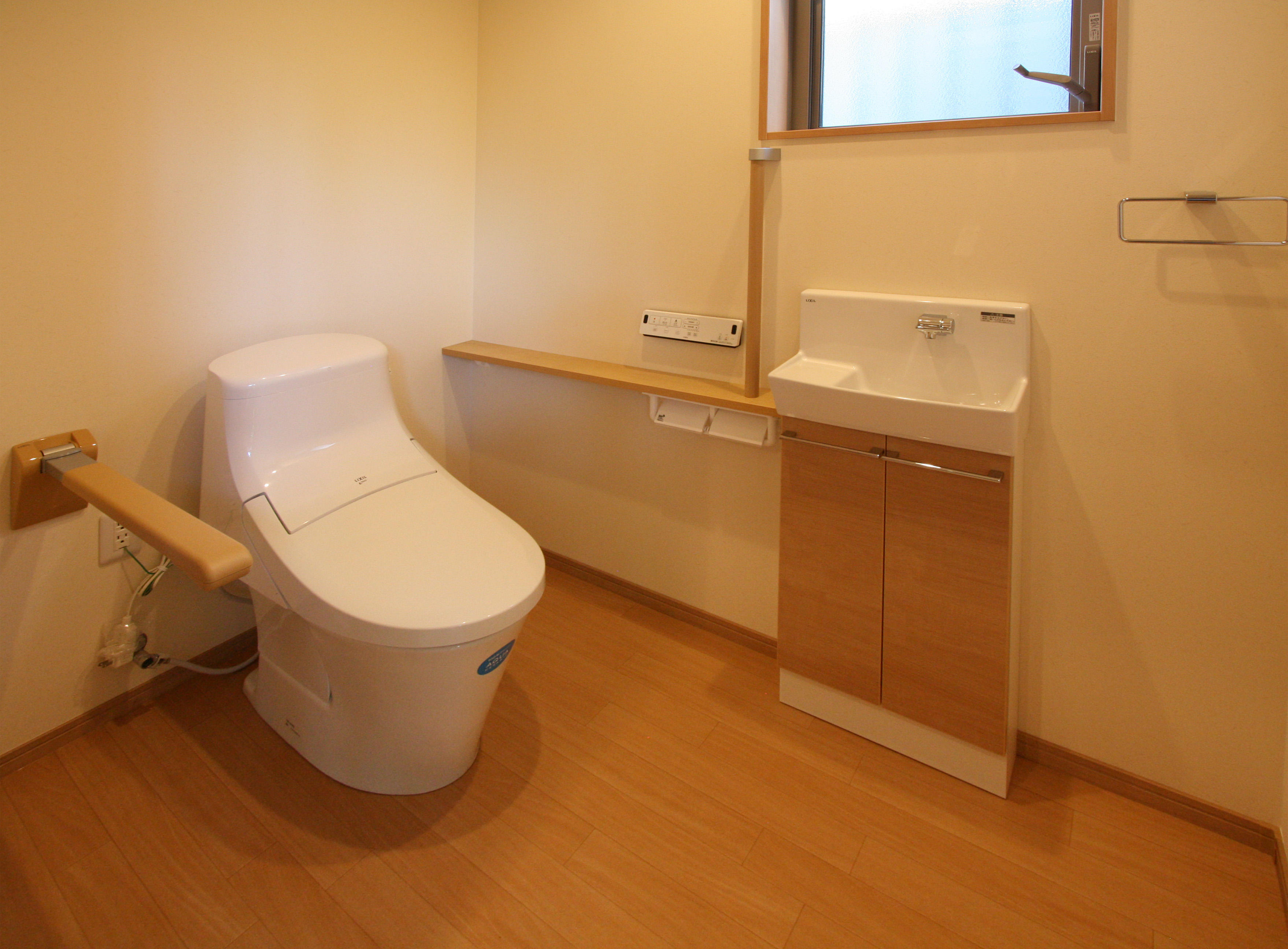 足腰の弱ったお施主様に立ち座りが楽になるように、洋式トイレとし、左右両方に手摺を設けました。また、入り口は3枚連動引き戸で、空間も広く取ってあり、介助が楽にできるようになっています。