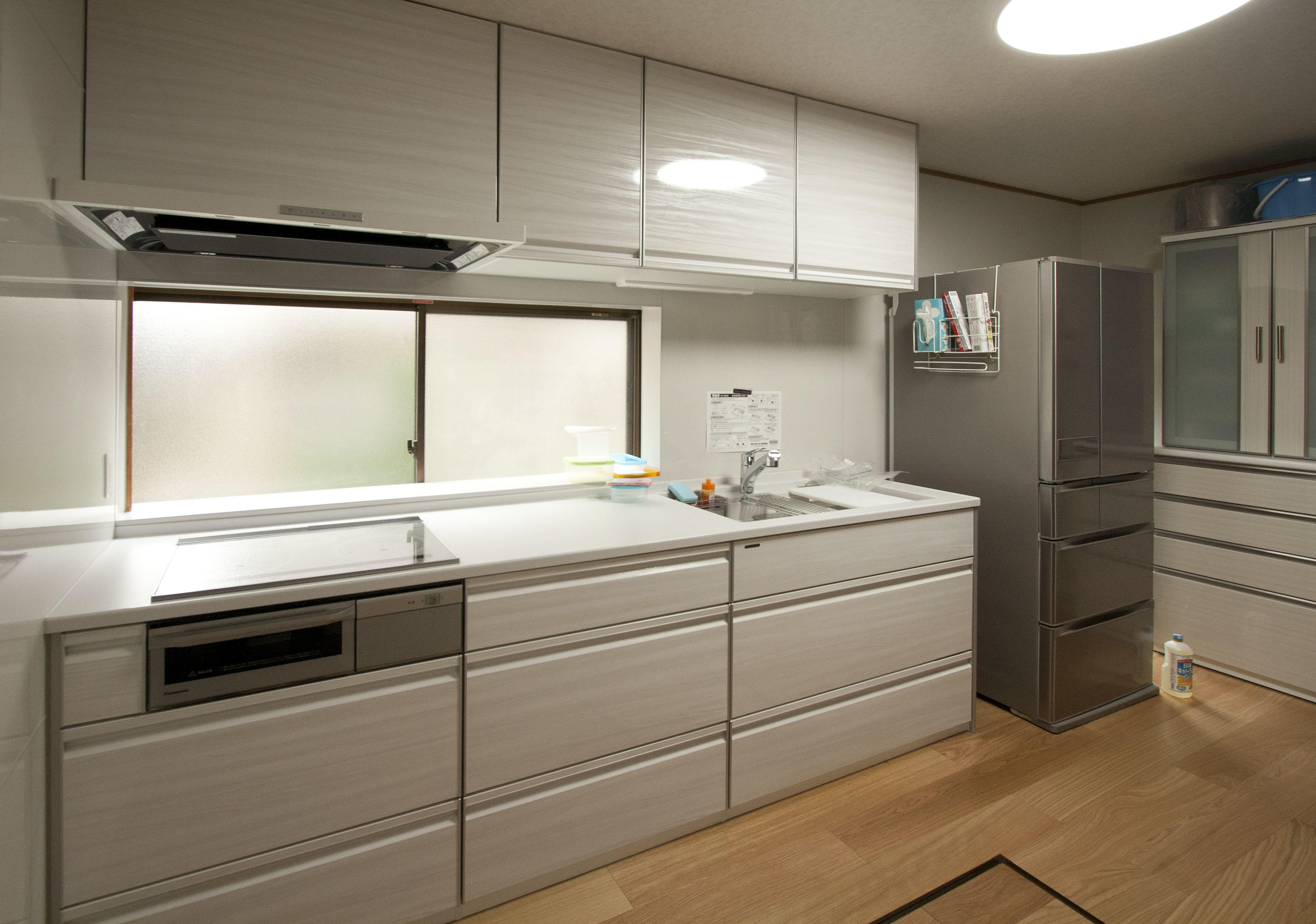 L型の大型キッチンをI型のコンパクトなキッチンに変えました。 収納量は以前にも増して大容量になり、引き出しタイプで使い勝手も良くなり大変便利になりました。 床は、最高級のフローリングで15mm厚のUV塗装品に貼り替え、耐久性と歩行感が向上しました。 また床の高さレベルを高く設定し、今後の建物全体のバリアフリー化を見越して工事を行いました。