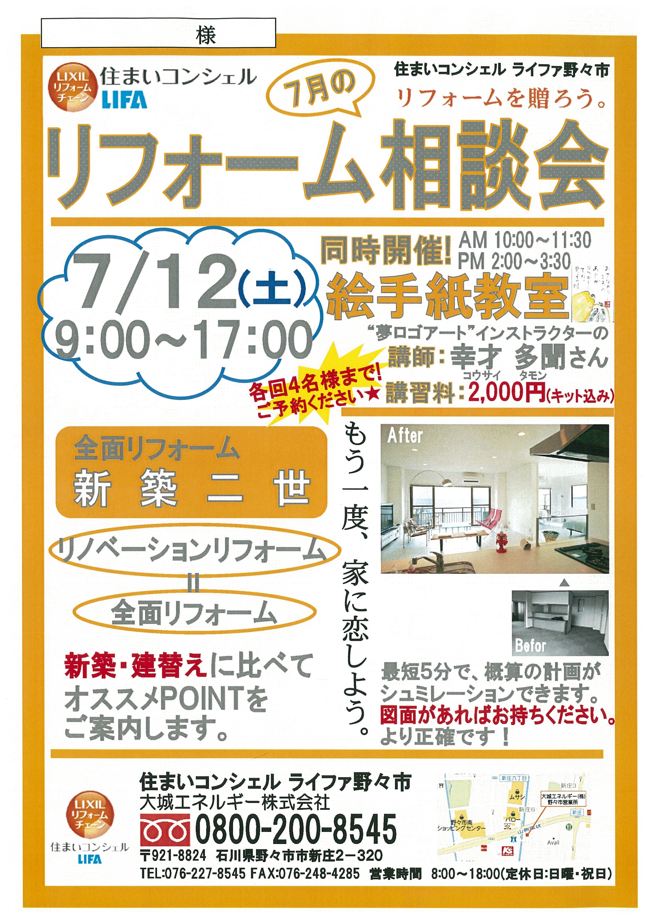 ライファ野々市では、毎月第2土曜日にリフォーム相談会を開催いたします!