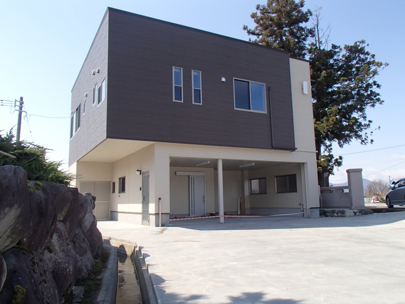 倉庫にならないように前面2階部分を跳ね出しをしました。外壁を上下に2色に分け、立体的にも分けることにより良くなったと思います。