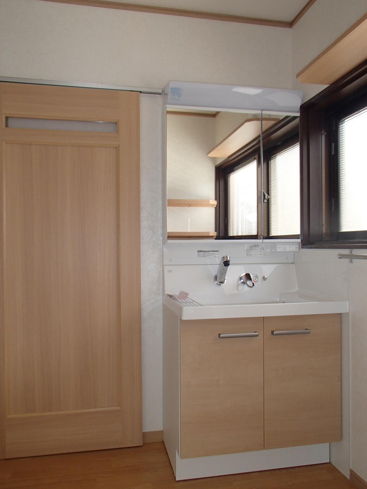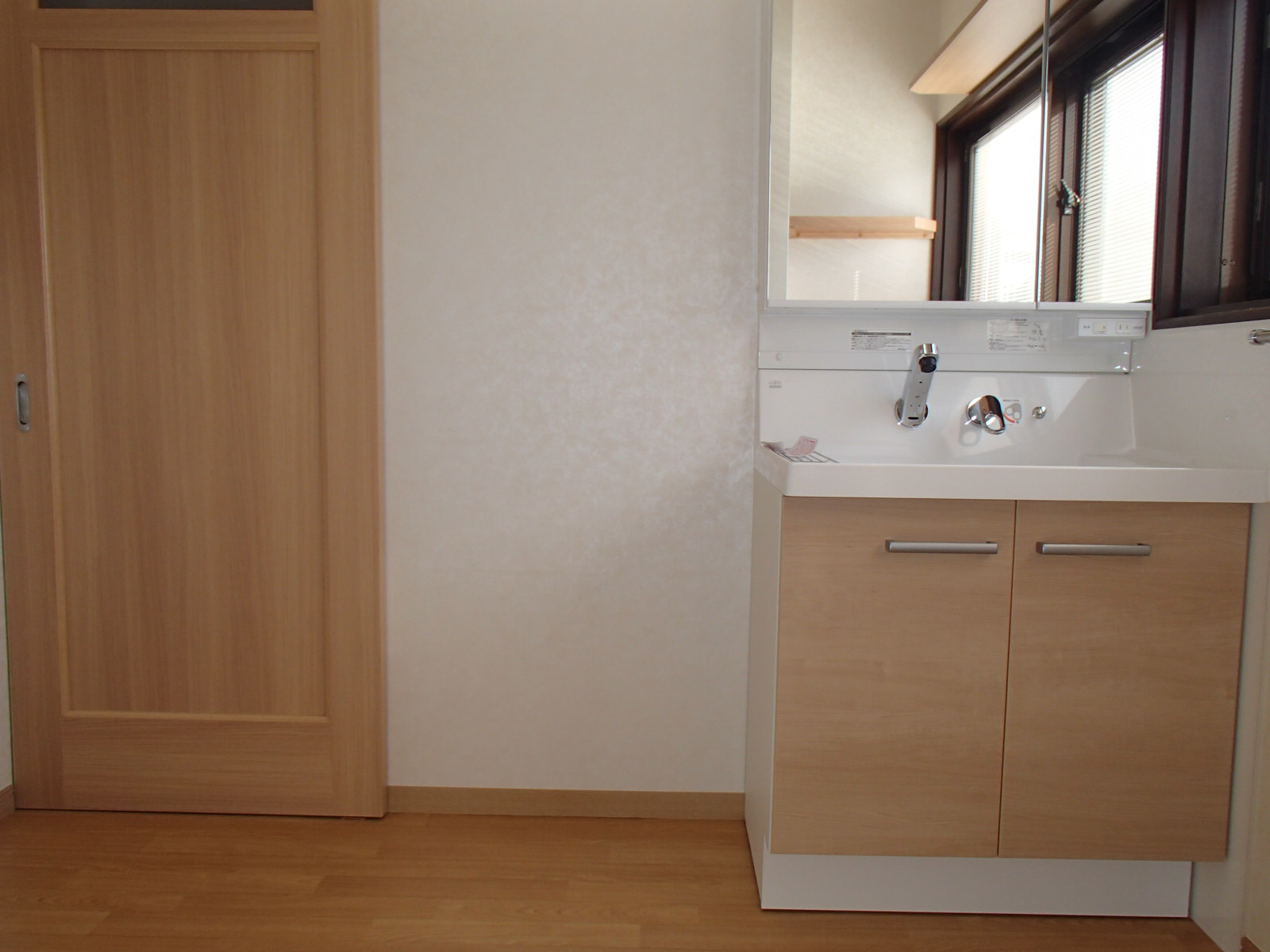 洗面化粧台と床と建具の色を合わせました。 白いクロスとマッチして温かいイメージを意識しました
