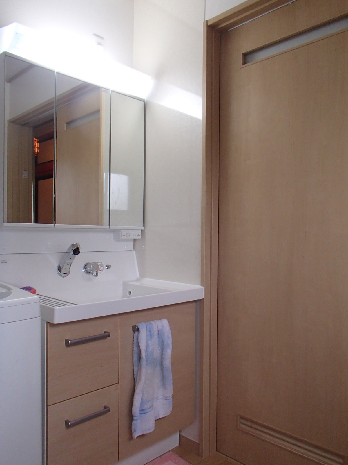 いままでは小物を置く場所がなく、窓に置いていましたが、洗面化粧台を新しくしてミラーの後ろに片付けることが出来るので、すっきりとしました。