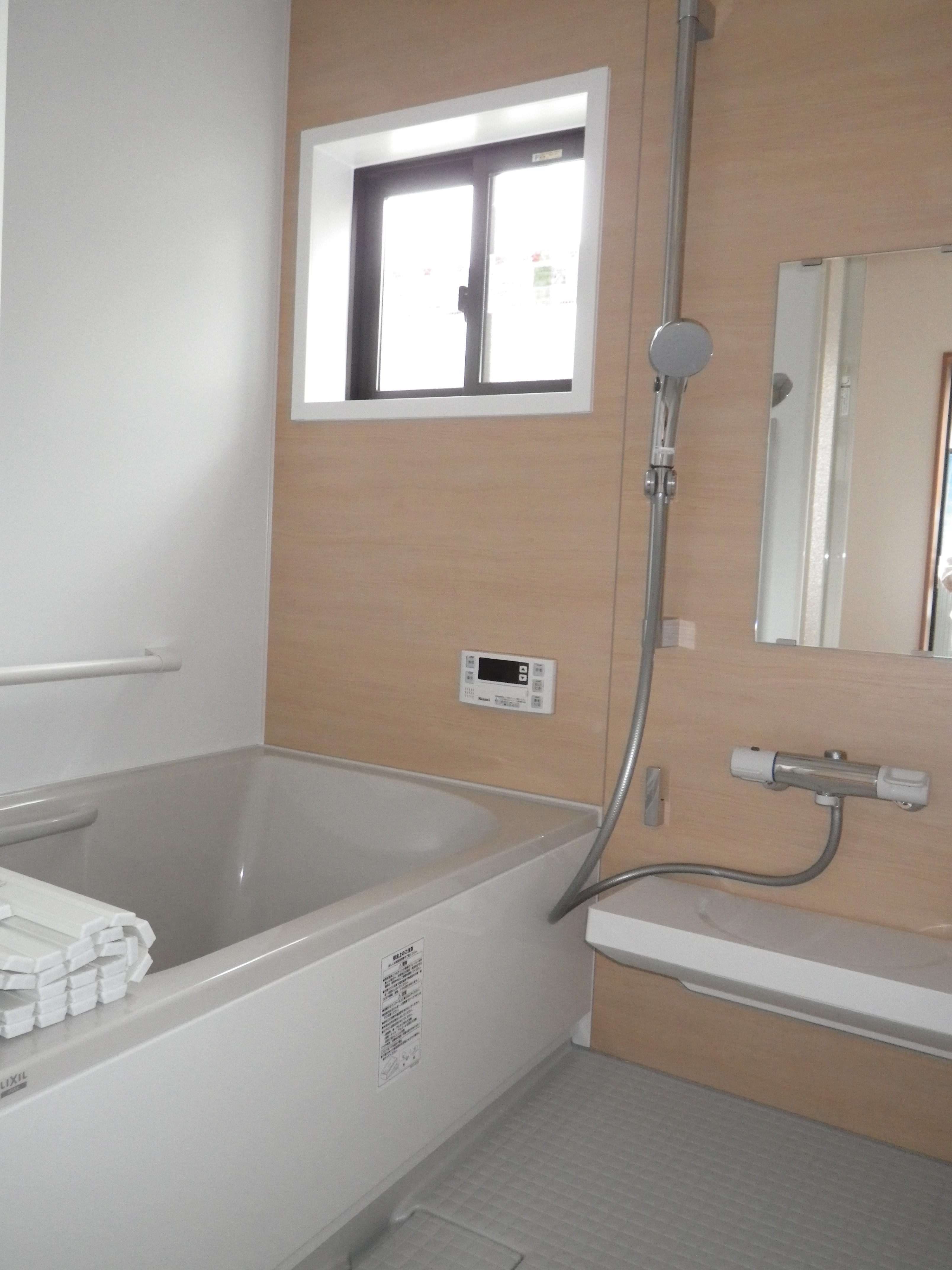 脱衣場も改修して段差をなくし、お年寄りに優しくなりました。 浴槽内は浴室での動きを補助する手摺を付けました。