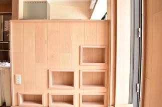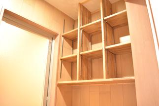 勝手口横の壁にも収納があるので小物や靴を置く事が出来ますね。