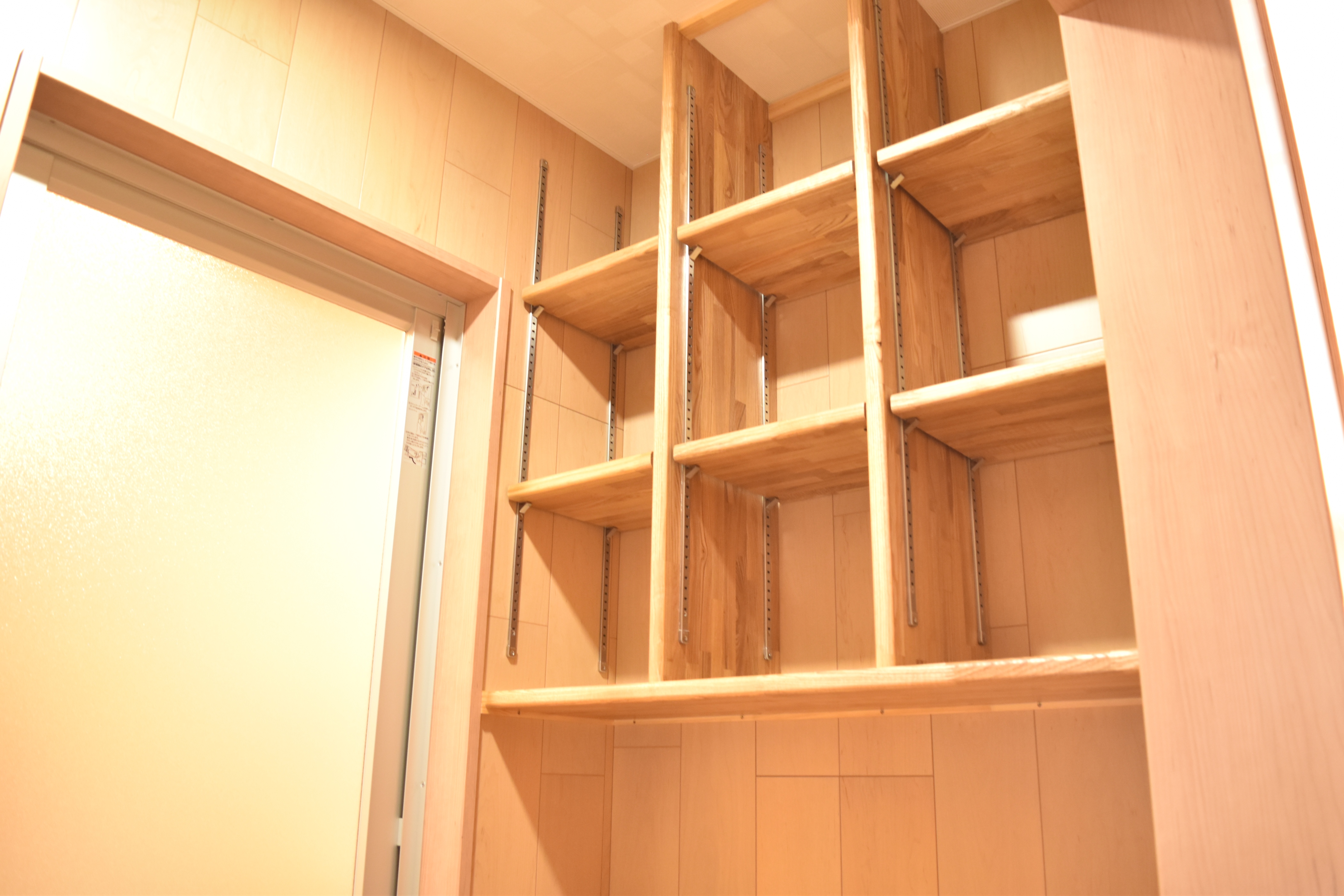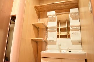 洗面化粧台後ろにも棚を設置して着替えやタオルを置くのに重宝しそうです。