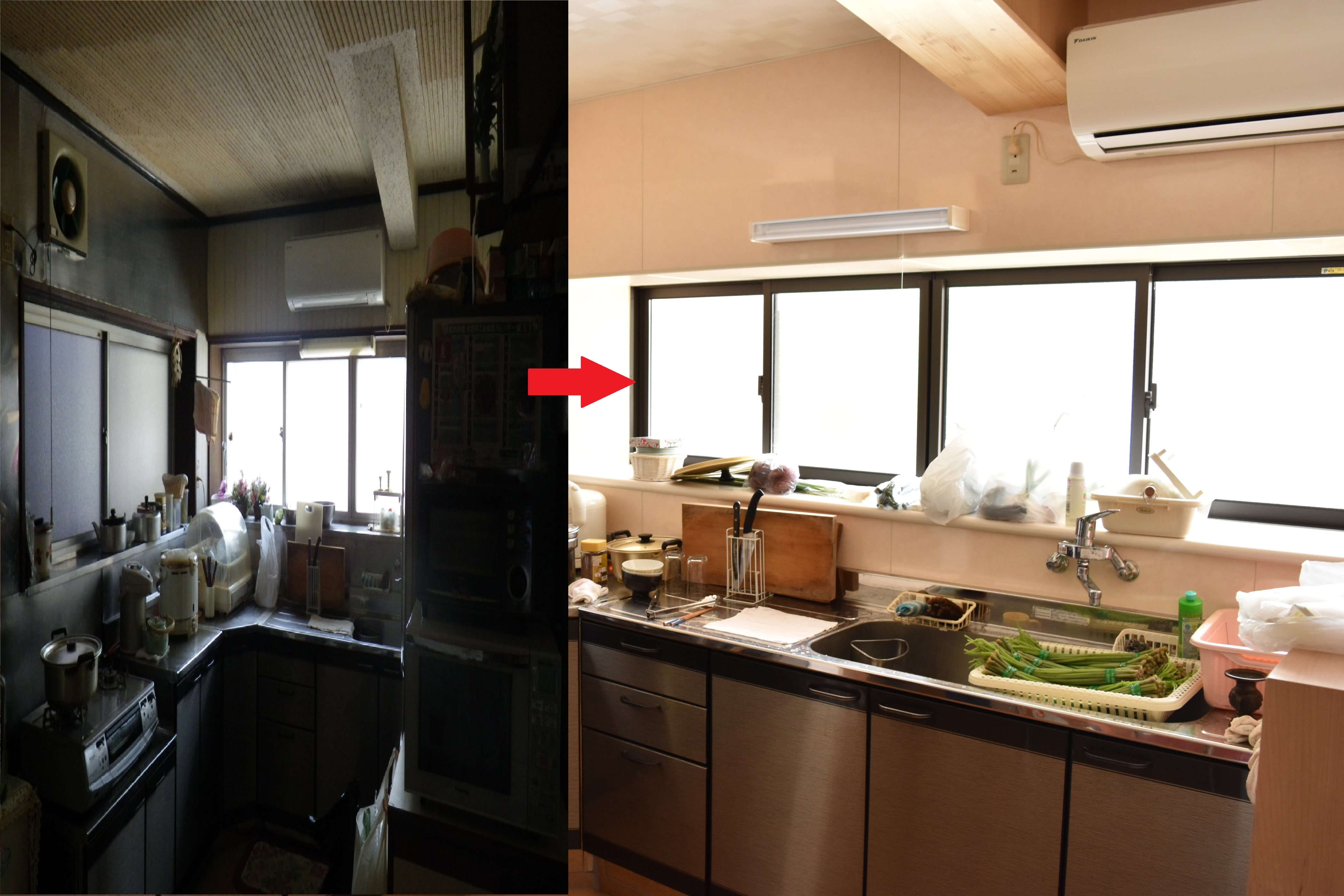 台所は既設のキッチンはそのまま利用し、天井・床・壁の貼り替え及び窓とレンジフードを新しくしました。以前は暗かった台所がとても明るくなりました。