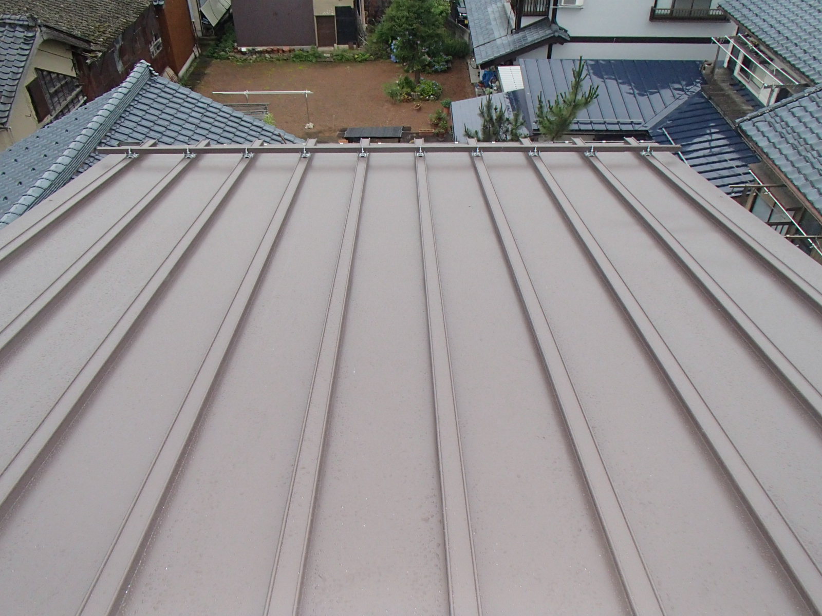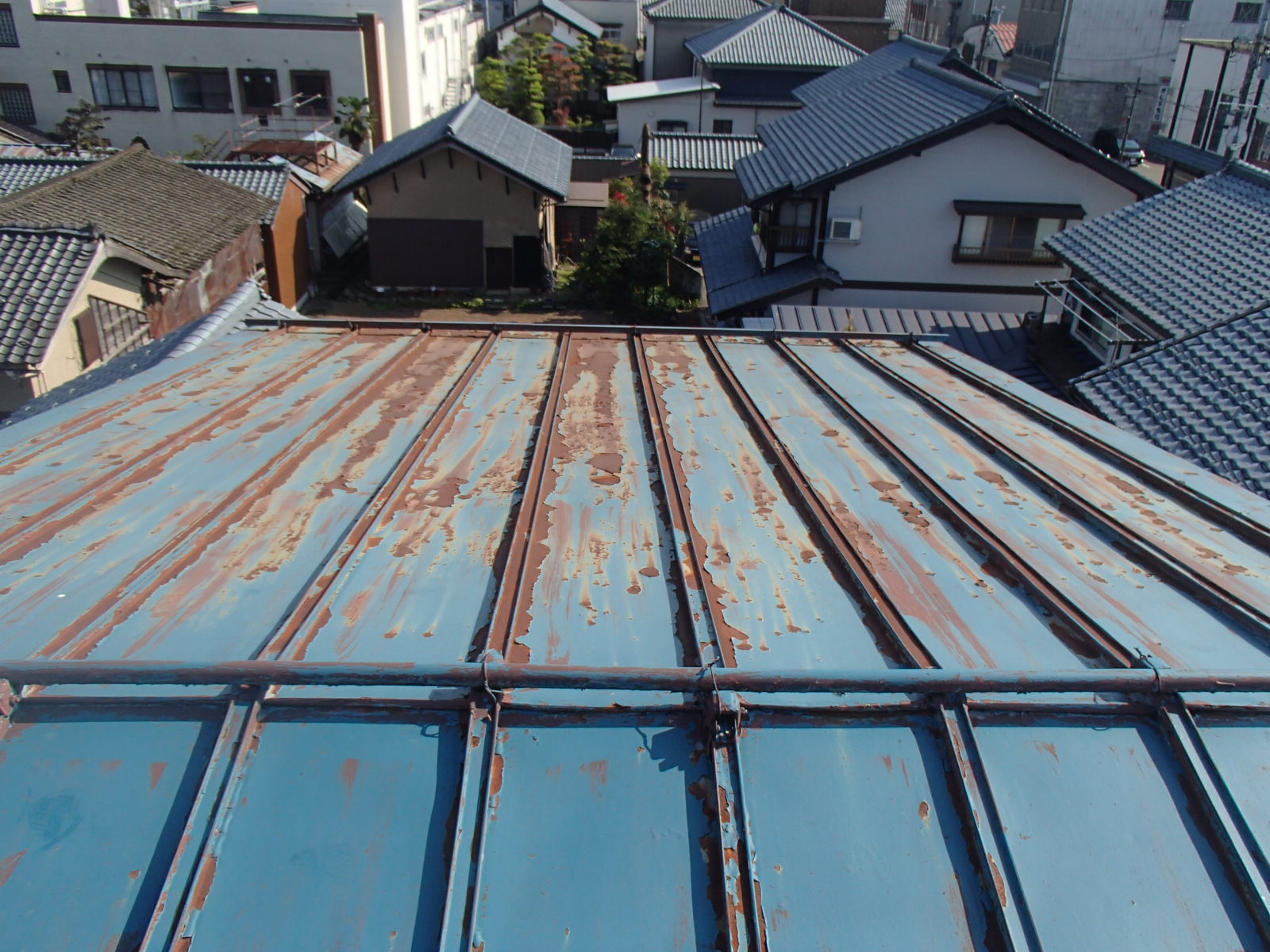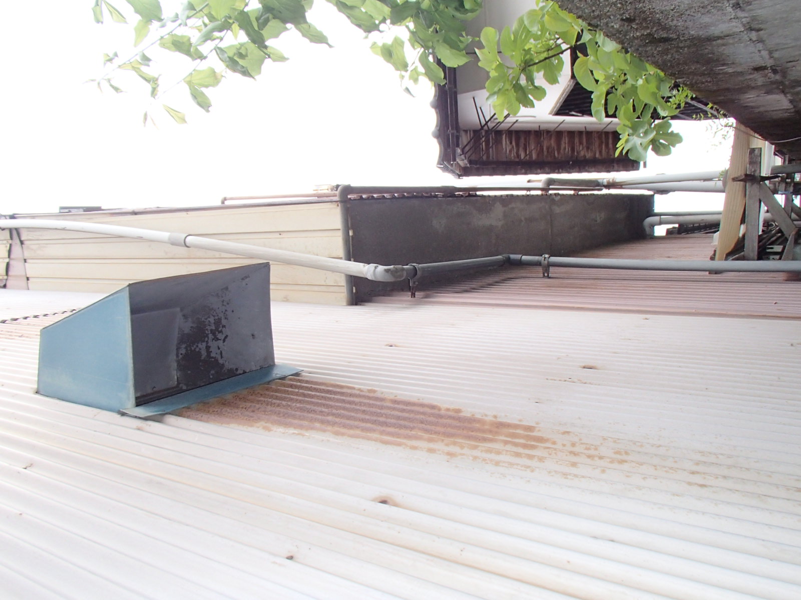 当初、塗装工事と板金工事(カバー工法)と検討をしていましたが、 建物も高く、塗装を取る際の飛散物防止と、元の屋根板も薄くなっていたので、穴が開く可能性もありカバー工法をオススメしました。
