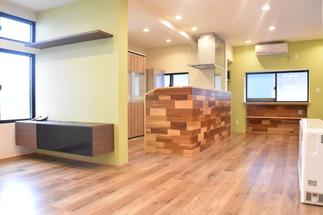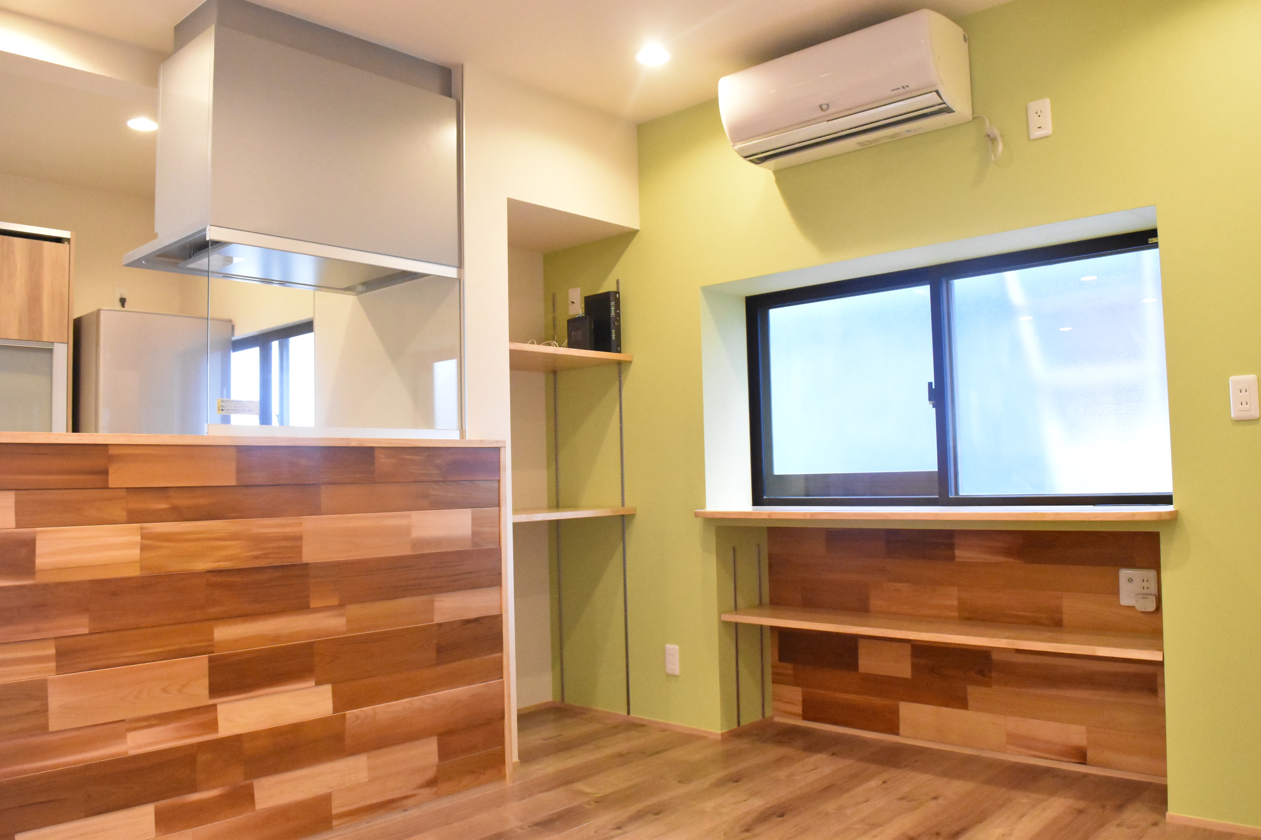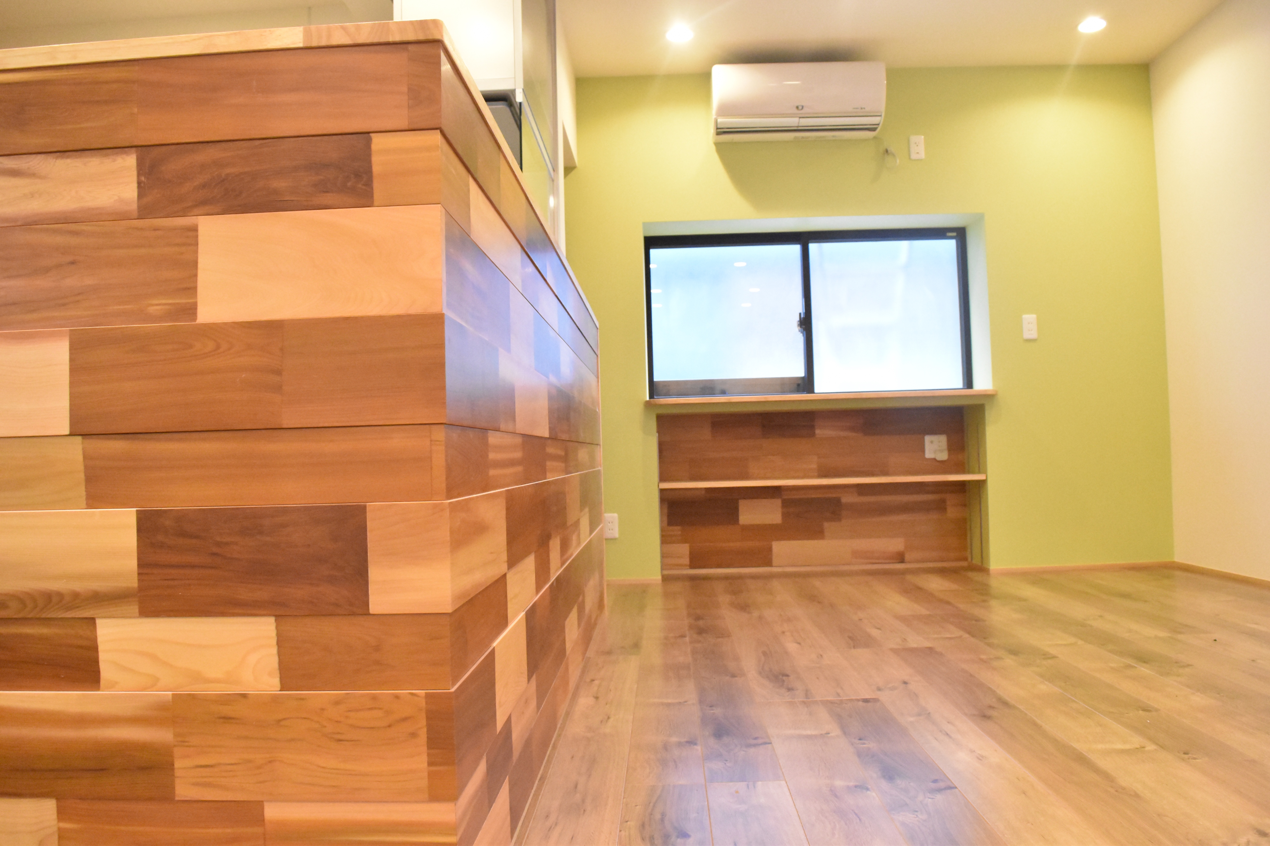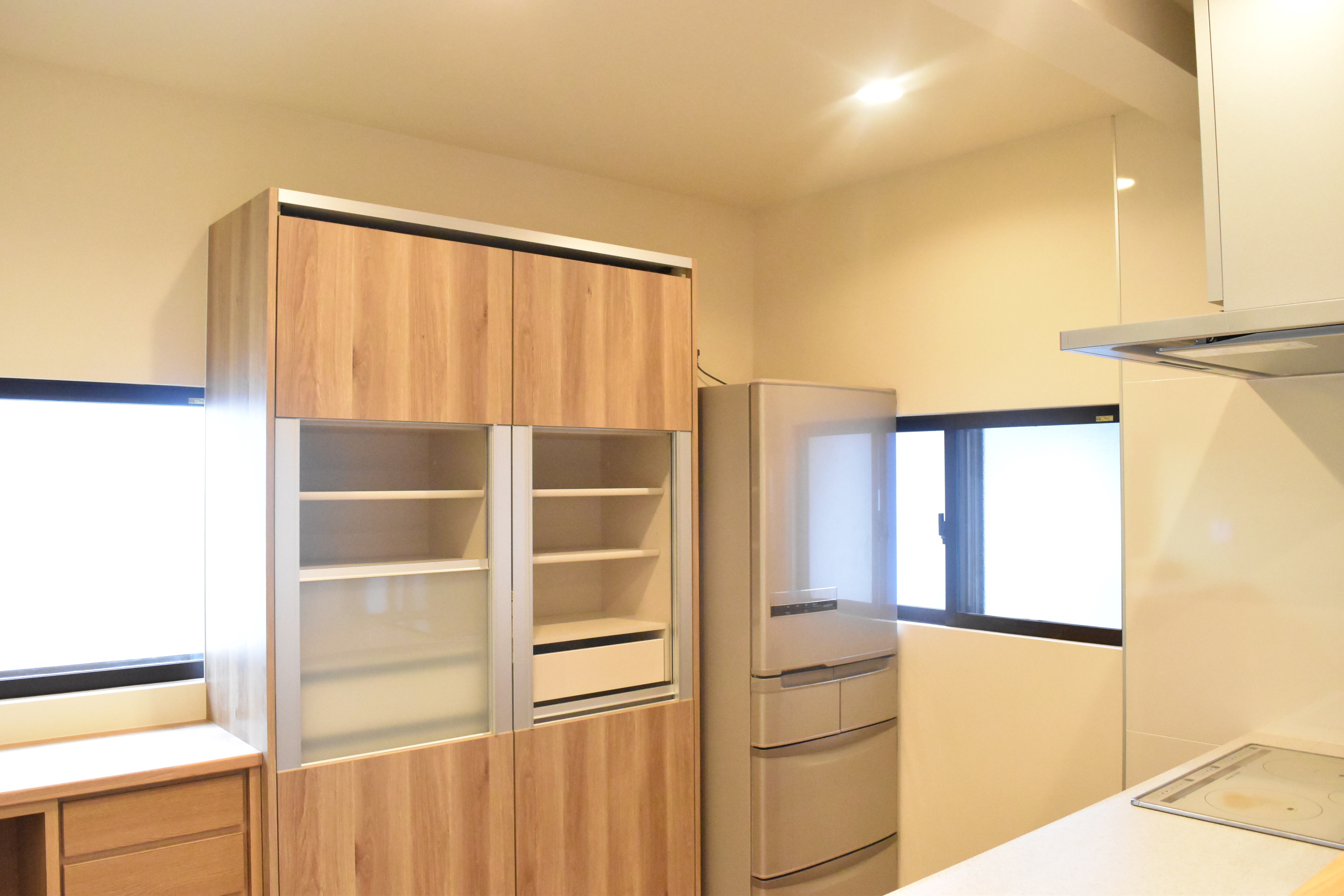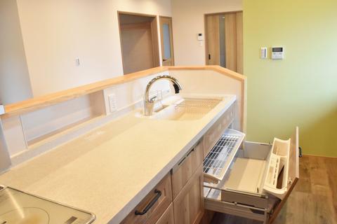 下の収納スペース部分はキッチンのカウンターとお揃いですね。