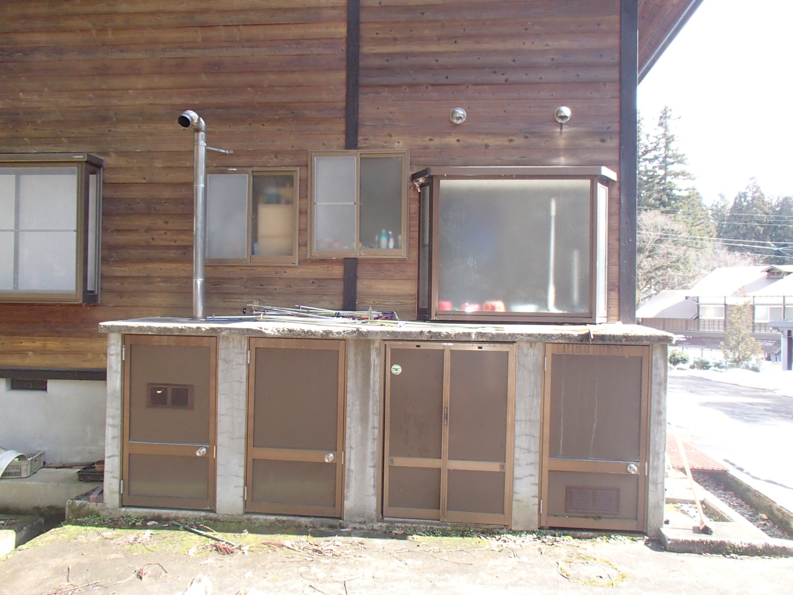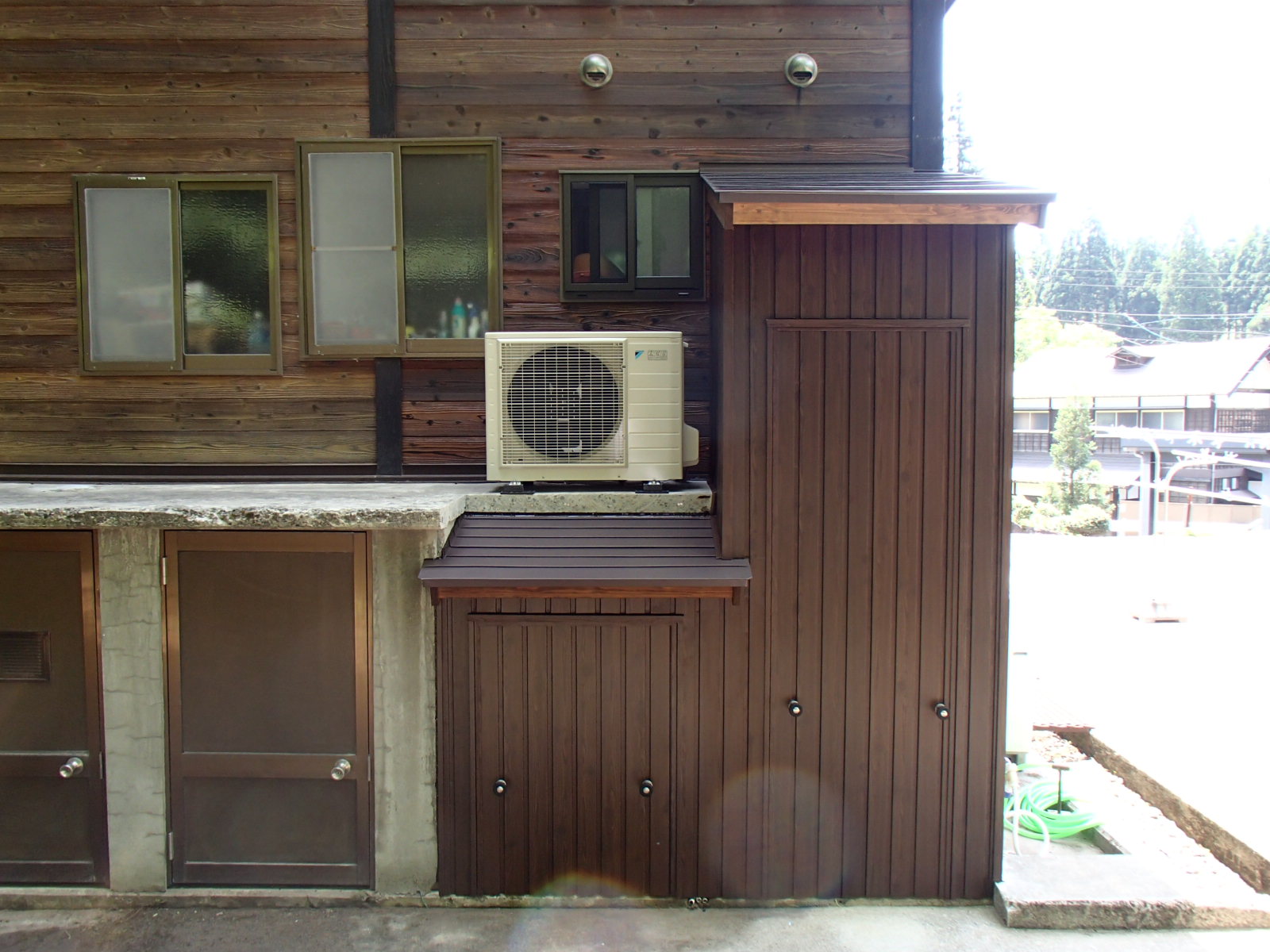 エコキュートの小屋を設置 出窓を無くし、小屋を作りました。 2枚の扉になる為、開きにせず、取外し式にしました。