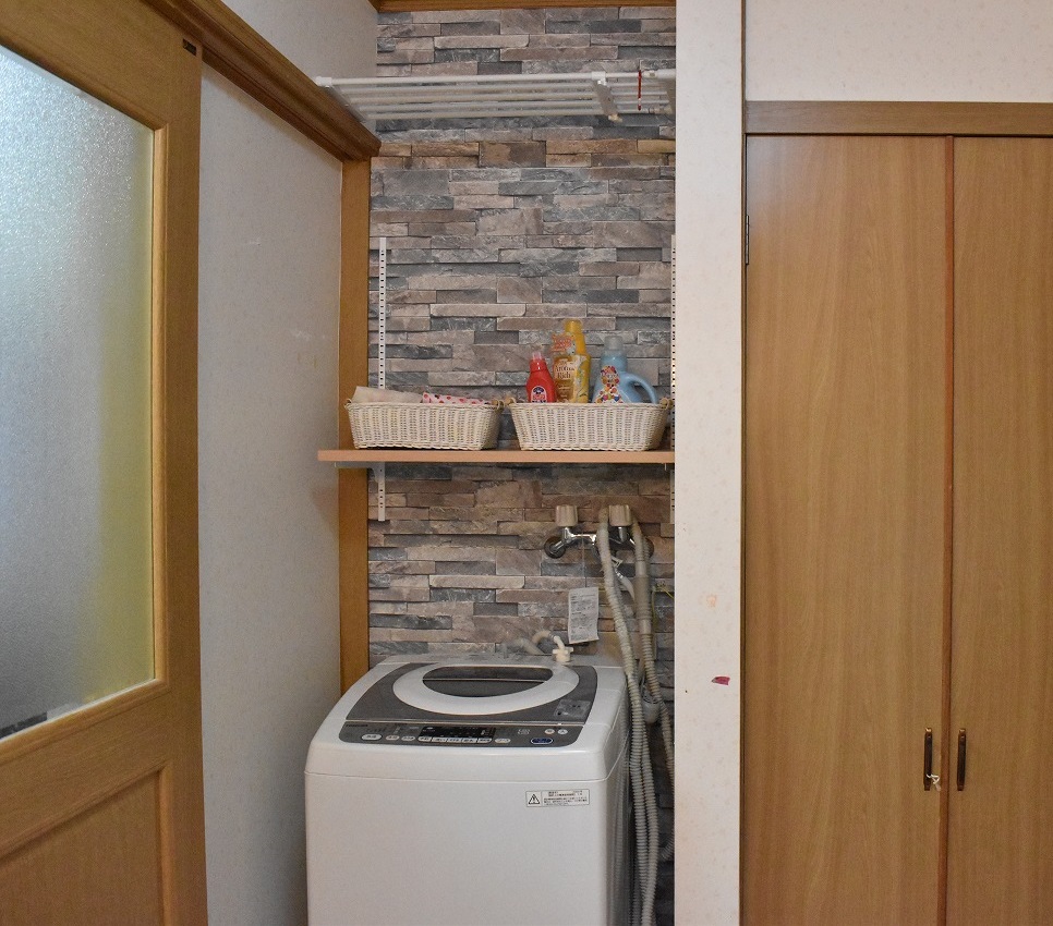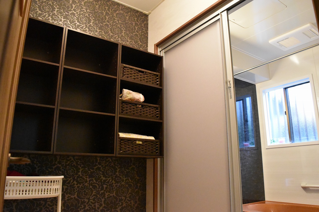 浴室の隣は洗面台を移設して脱衣所のみの空間にしました。 奥様のアイディアより、棚を設置して衣類を入れやすいようにしました。