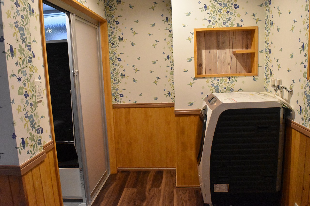 浴室の入り口を引戸に替えて、出入りも楽になりました。 脱衣室も少し広くなり、壁紙や床材を張り替えて、 とっても可愛らしいイメージになりました。