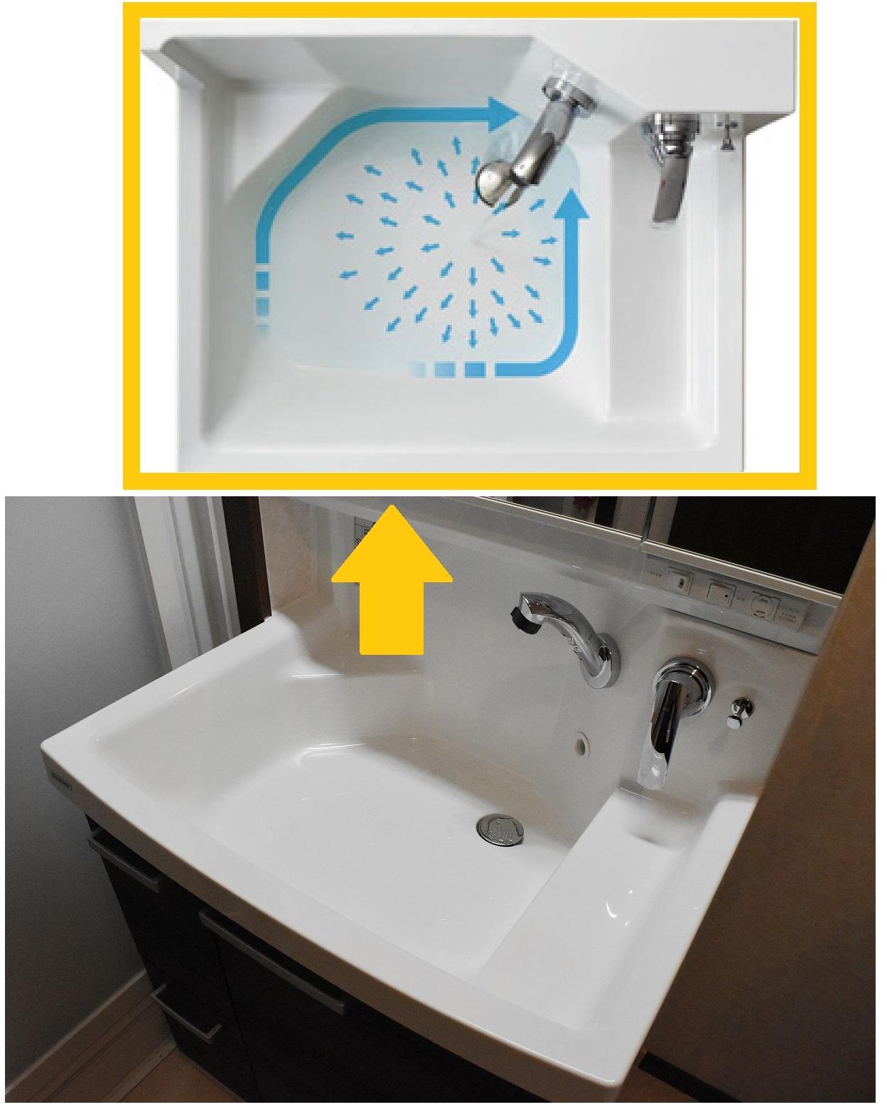「流レール」が髪の毛や泡を集めて排水口に流します。中央を高くするという逆転の発想でボールの全体に水が行き届きます。