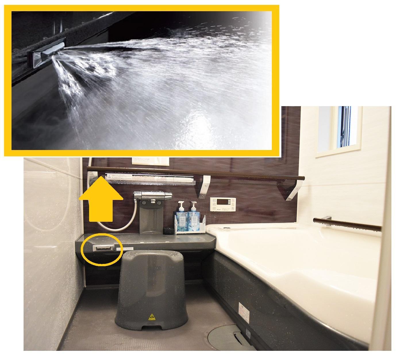 床に向かって一気に噴出するお湯のシャワーによって、浴室への一歩目からあたたかいです。入浴前に脱衣所のスイッチを押すだけで、床面を25℃まで温めてくれます♪