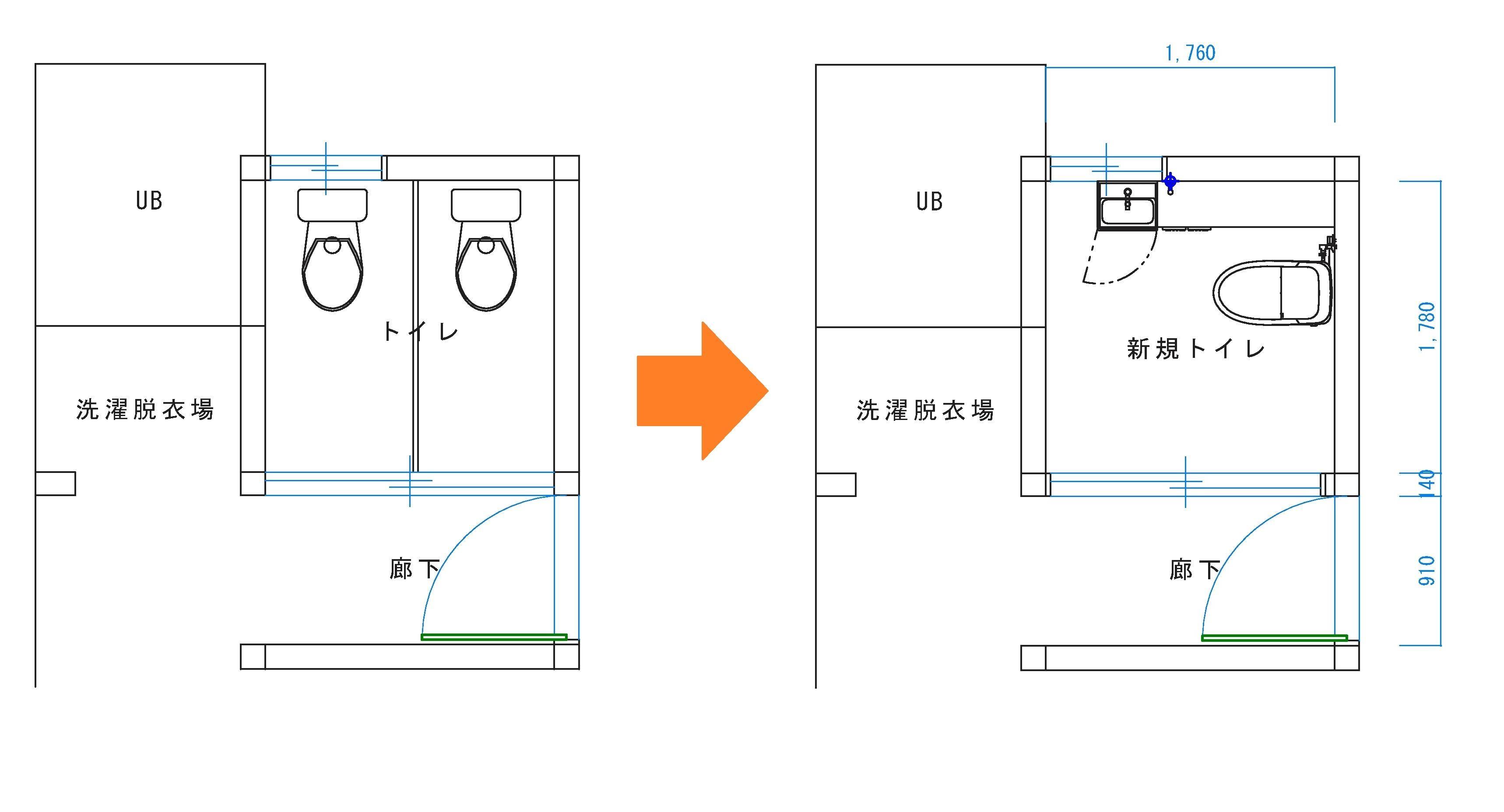 “洋便器が2台あるのを1台にしたい”というご依頼を頂きました。折込チラシを見てご連絡頂きました。 施工費:50万~70万円