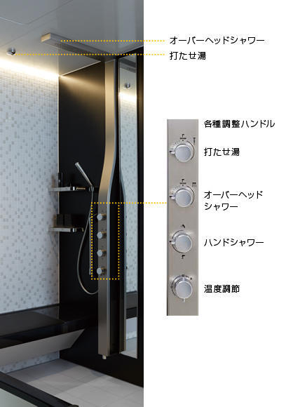 マッサージ効果が期待されている“打たせ湯”や、全身を包み込むように広がる“オーバーヘッドシャワー”などの機能が付いています。
