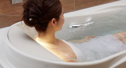 スパージュの魅力の1つであるアクアフィール。写真イメージのように首や肩も温められる優れものです。血行が良くなり、健康や美容にも良さそうですね!