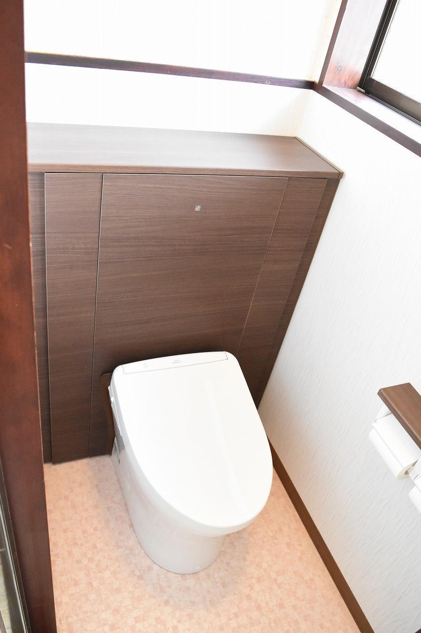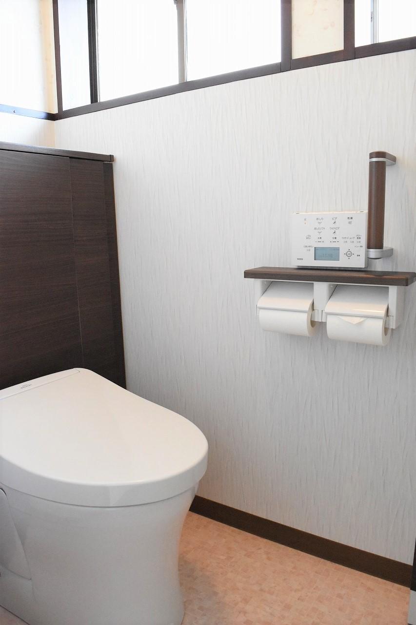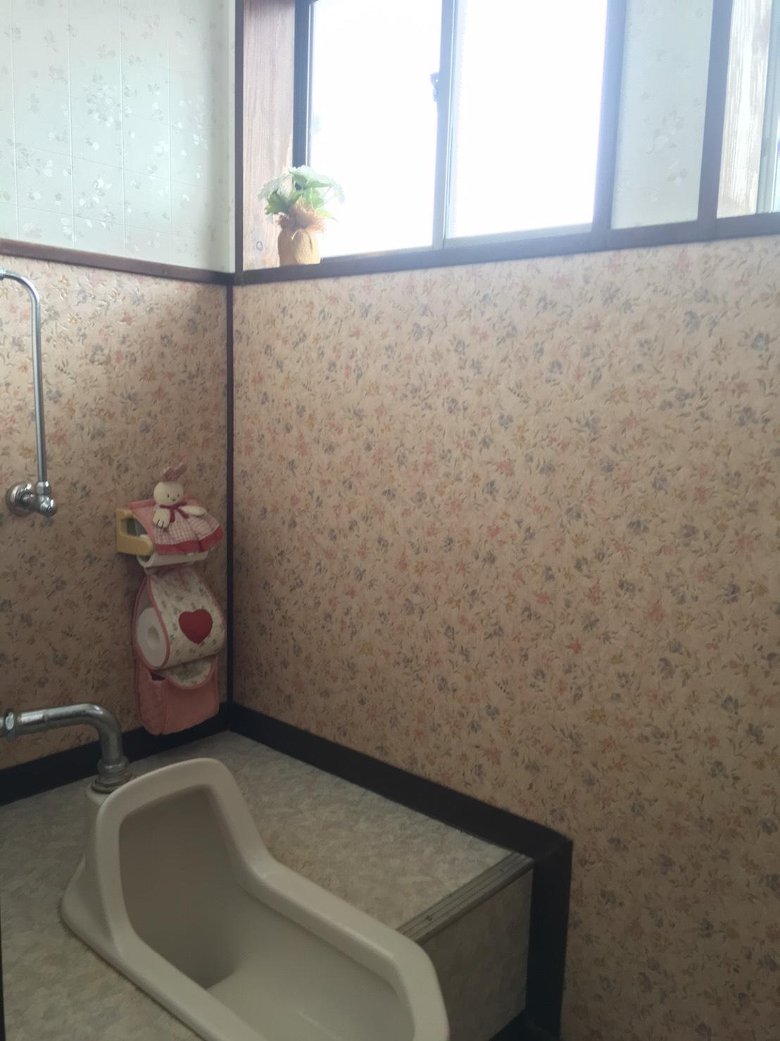 腰壁上部や天井は既存のものをそのまま使用して、腰壁と床を修繕しました。窓枠は塗装できれいにしました。快適なトイレ空間になったと思います。娘さんにも喜んでもらえると嬉しいです。