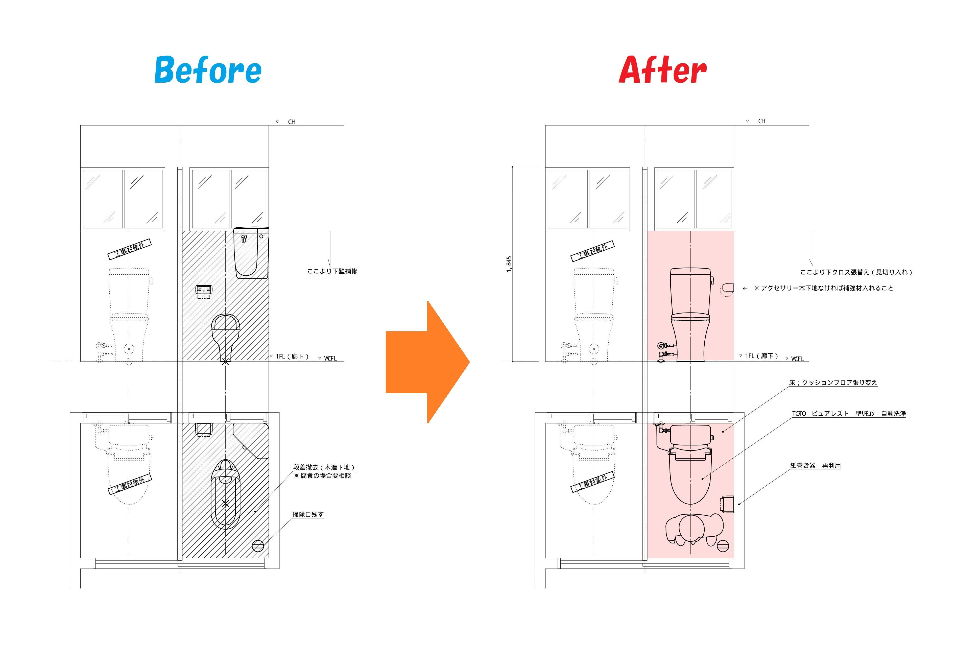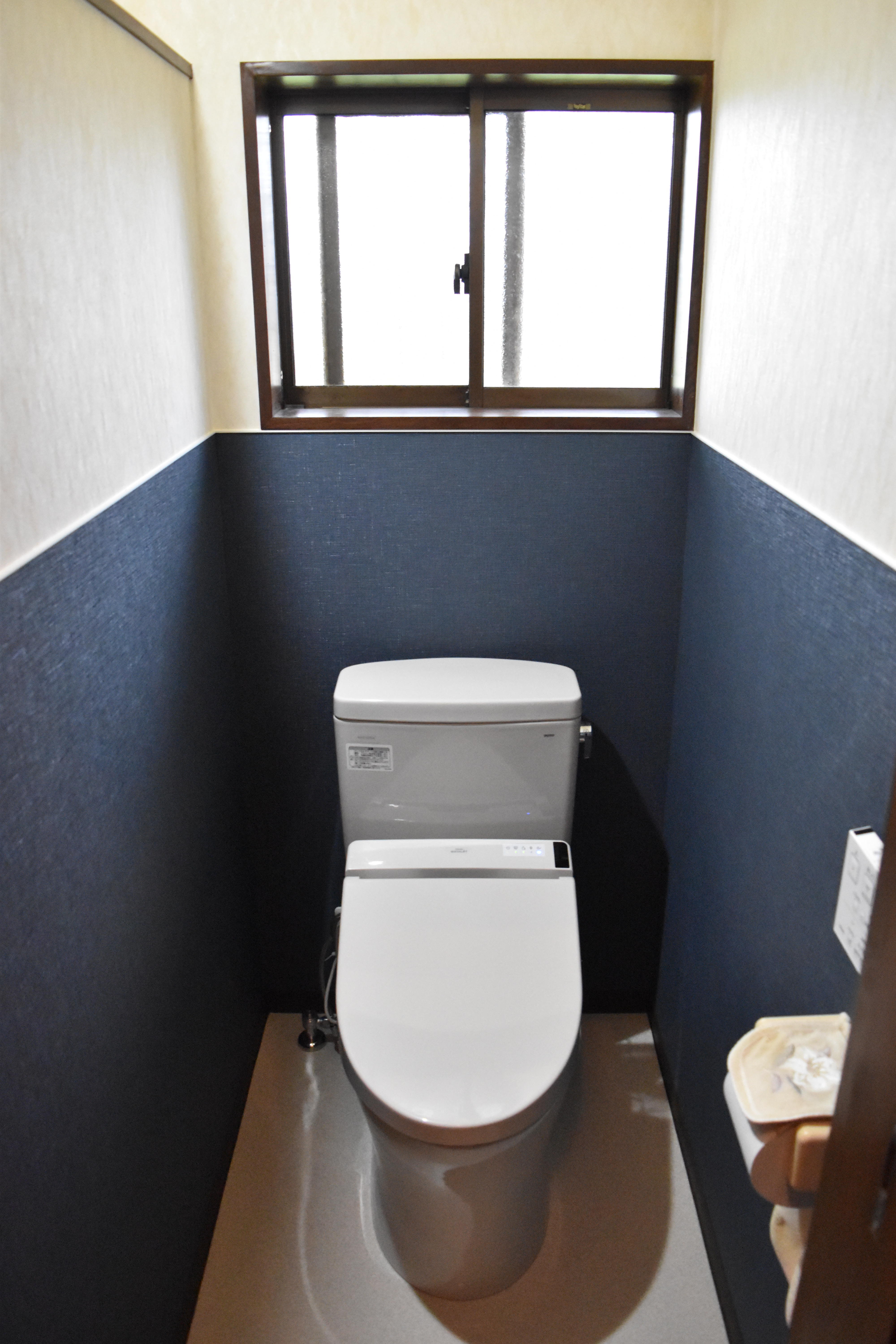 2つあるトイレのうち、和便器の方を洋便器に取替させて頂きました。和便器だと足への負担がかかるので、おばあちゃんには使いづらかったと思います。窓より下の部分のクロスを張替えて落ち着いた雰囲気のトイレ空間に仕上がりました。 施工費:30万~40万円 お引渡し:2020年6月